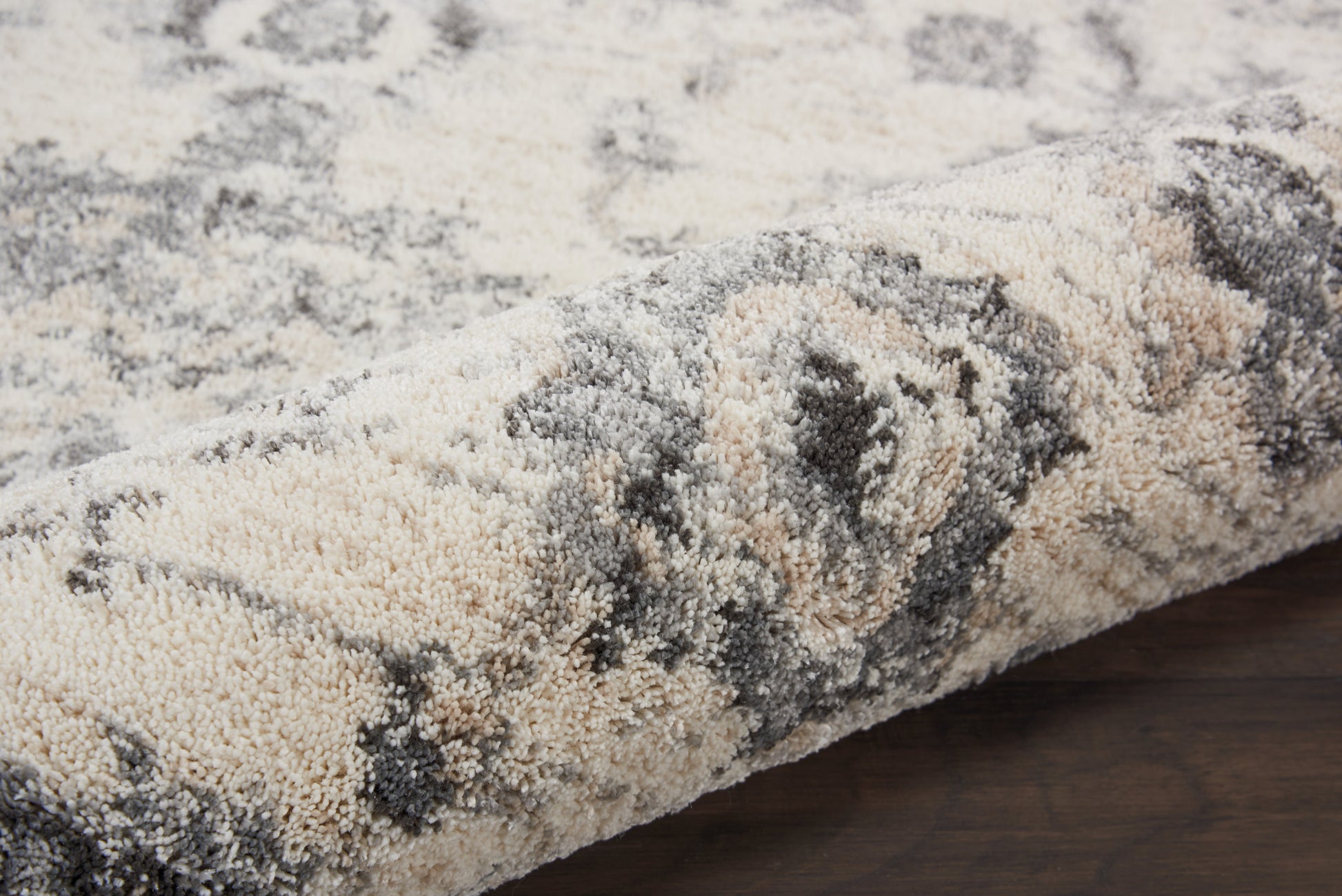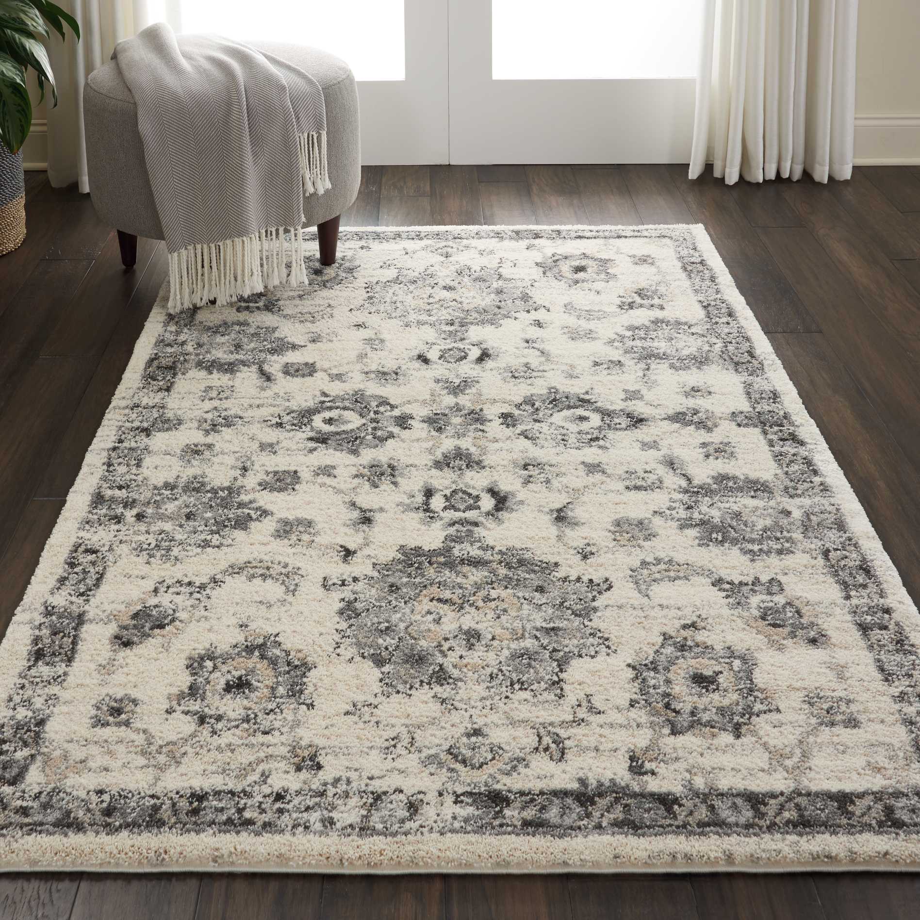 Traditional Persian rug design takes a luxurious turn in this plush Fusion Collection rug. Graceful floral patterns in shades of grey on a distressed cream pile provide a vintage look and feel, and add a regal tone to any room in the home.