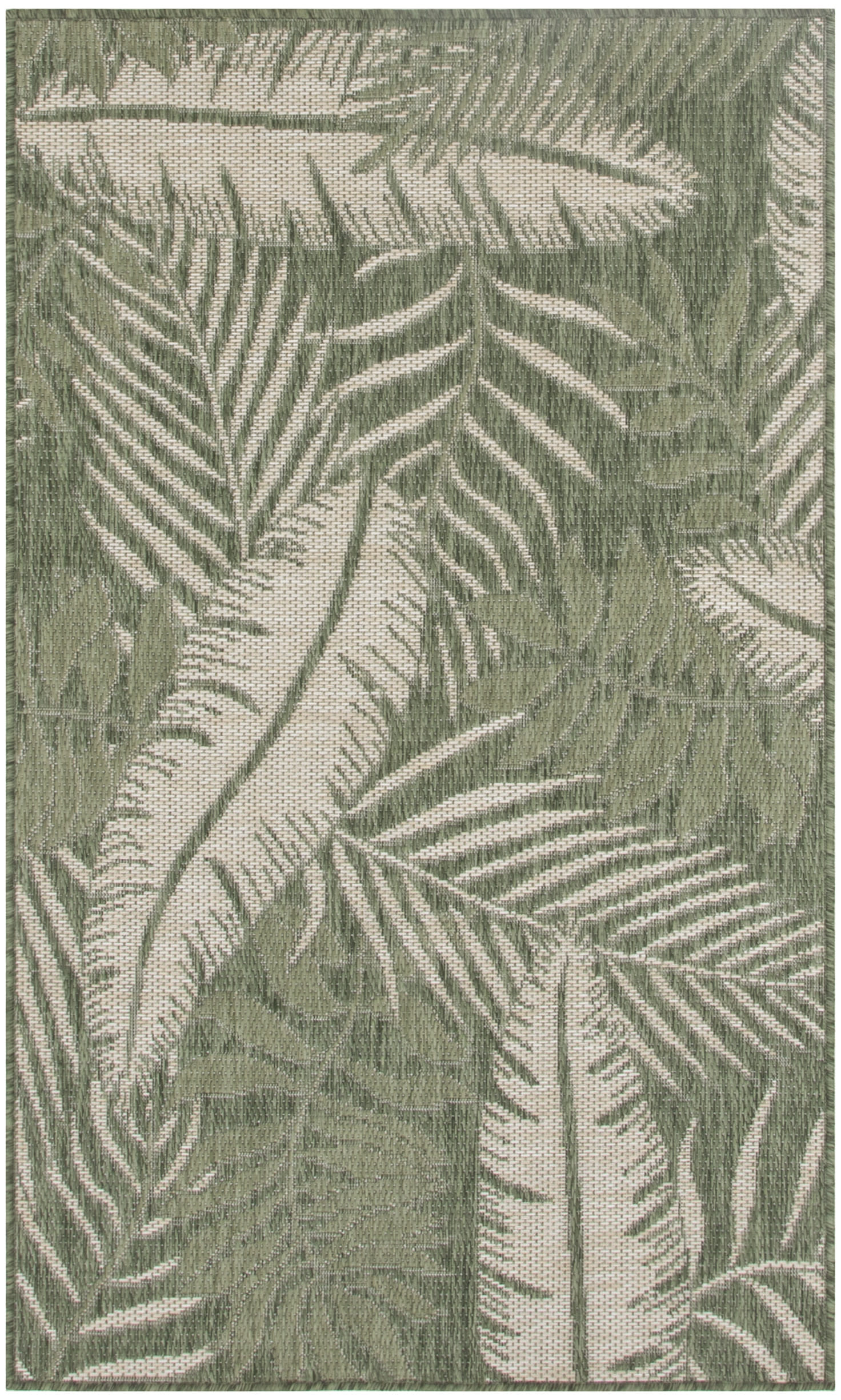Enjoy vacation vibes from the comfort of your backyard with this green and ivory outdoor rug from the Garden Oasis Collection. The oversized tropical leaf pattern evokes feelings of lounging by the beach, with subtle tonal variations that add rhythmic appeal. Machine-made from polypropylene yarns for lasting style and all-weather performance, this flatweave rug is great for both indoor and outdoor spaces. Hand washable outdoors: rinse with a hose and air dry.