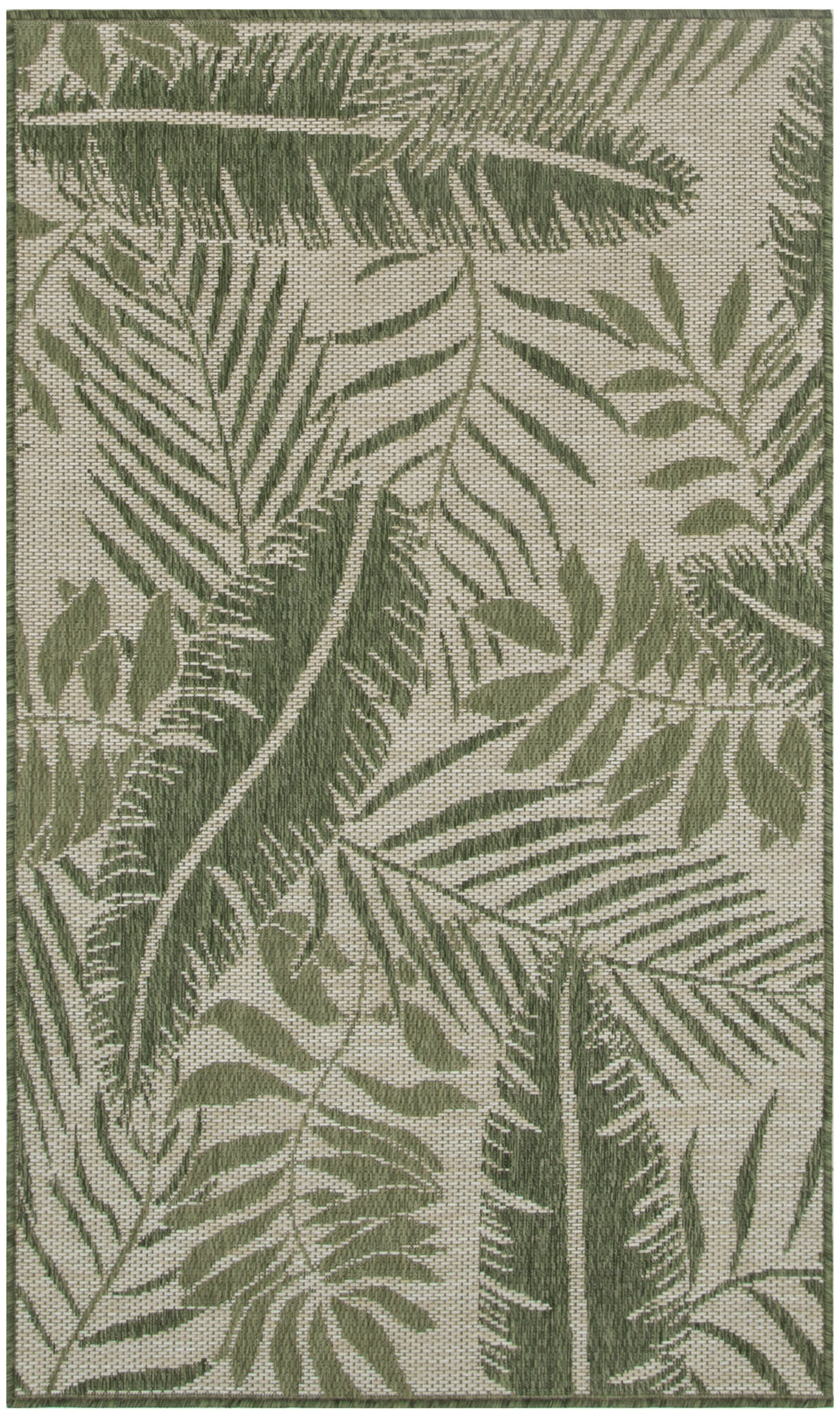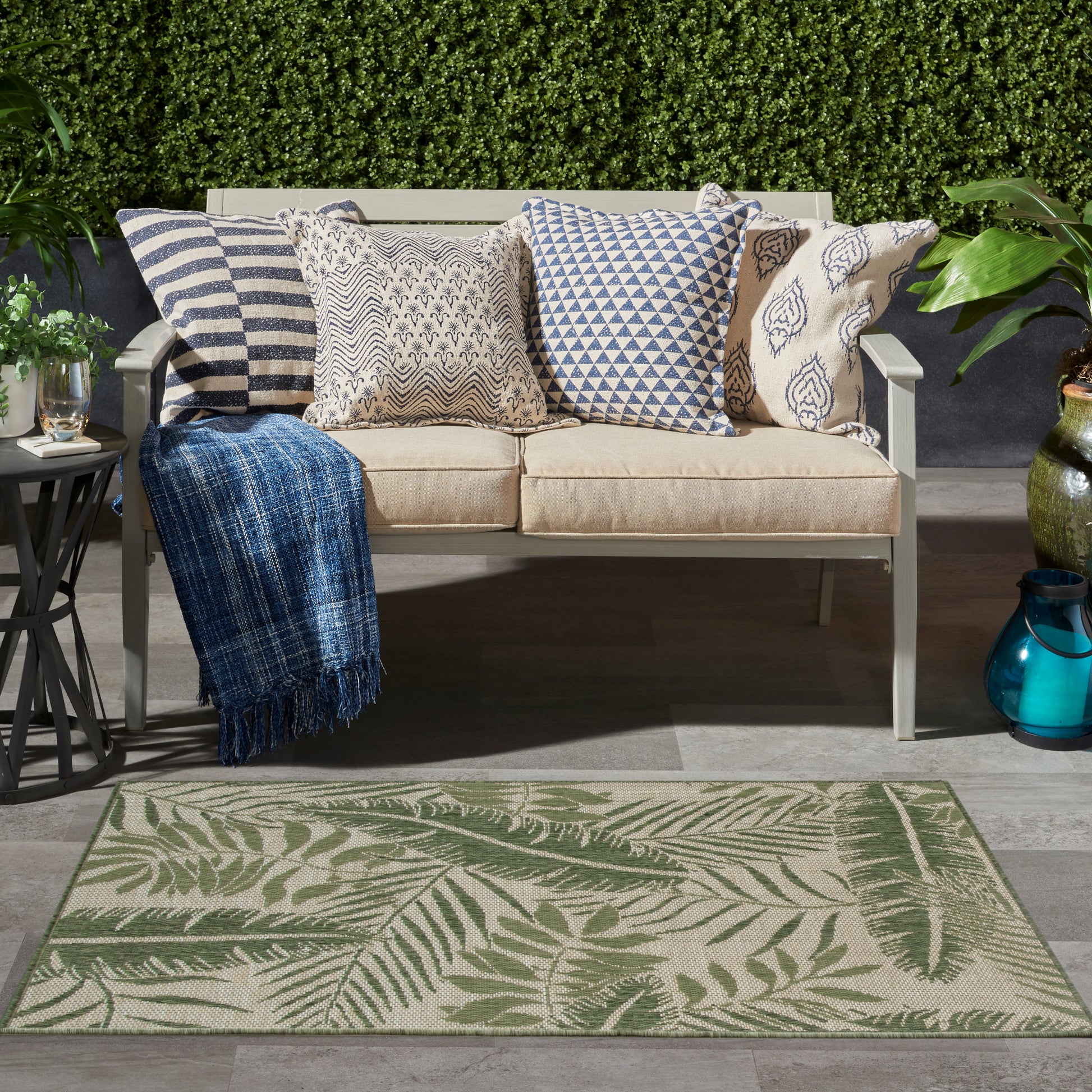 Enjoy vacation vibes from the comfort of your backyard with this ivory and green outdoor rug from the Garden Oasis Collection. The oversized tropical leaf pattern evokes feelings of lounging by the beach, with subtle tonal variations that add rhythmic appeal. Machine-made from polypropylene yarns for lasting style and all-weather performance, this flatweave rug is great for both indoor and outdoor spaces. Hand washable outdoors: rinse with a hose and air dry.