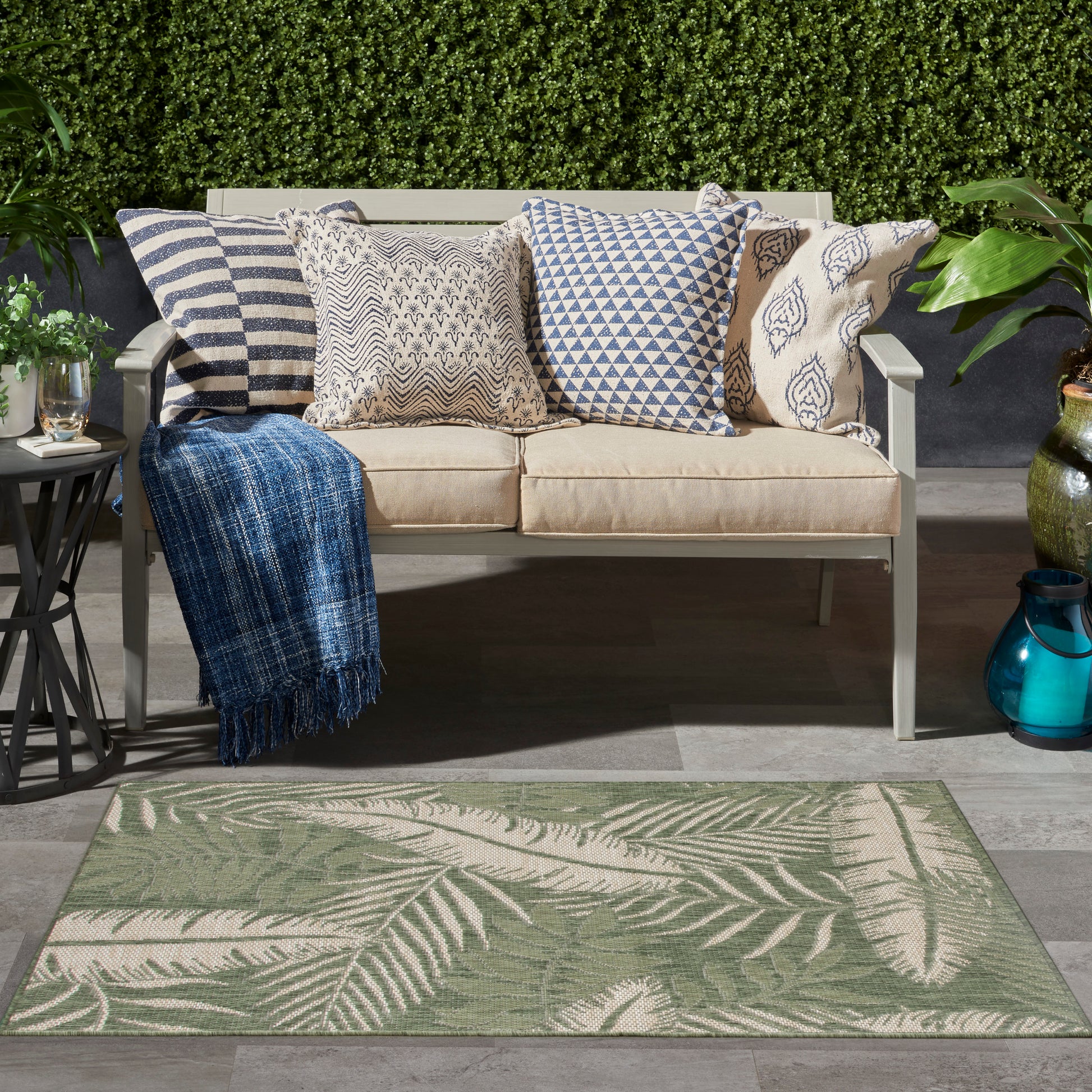 Enjoy vacation vibes from the comfort of your backyard with this green and ivory outdoor rug from the Garden Oasis Collection. The oversized tropical leaf pattern evokes feelings of lounging by the beach, with subtle tonal variations that add rhythmic appeal. Machine-made from polypropylene yarns for lasting style and all-weather performance, this flatweave rug is great for both indoor and outdoor spaces. Hand washable outdoors: rinse with a hose and air dry.