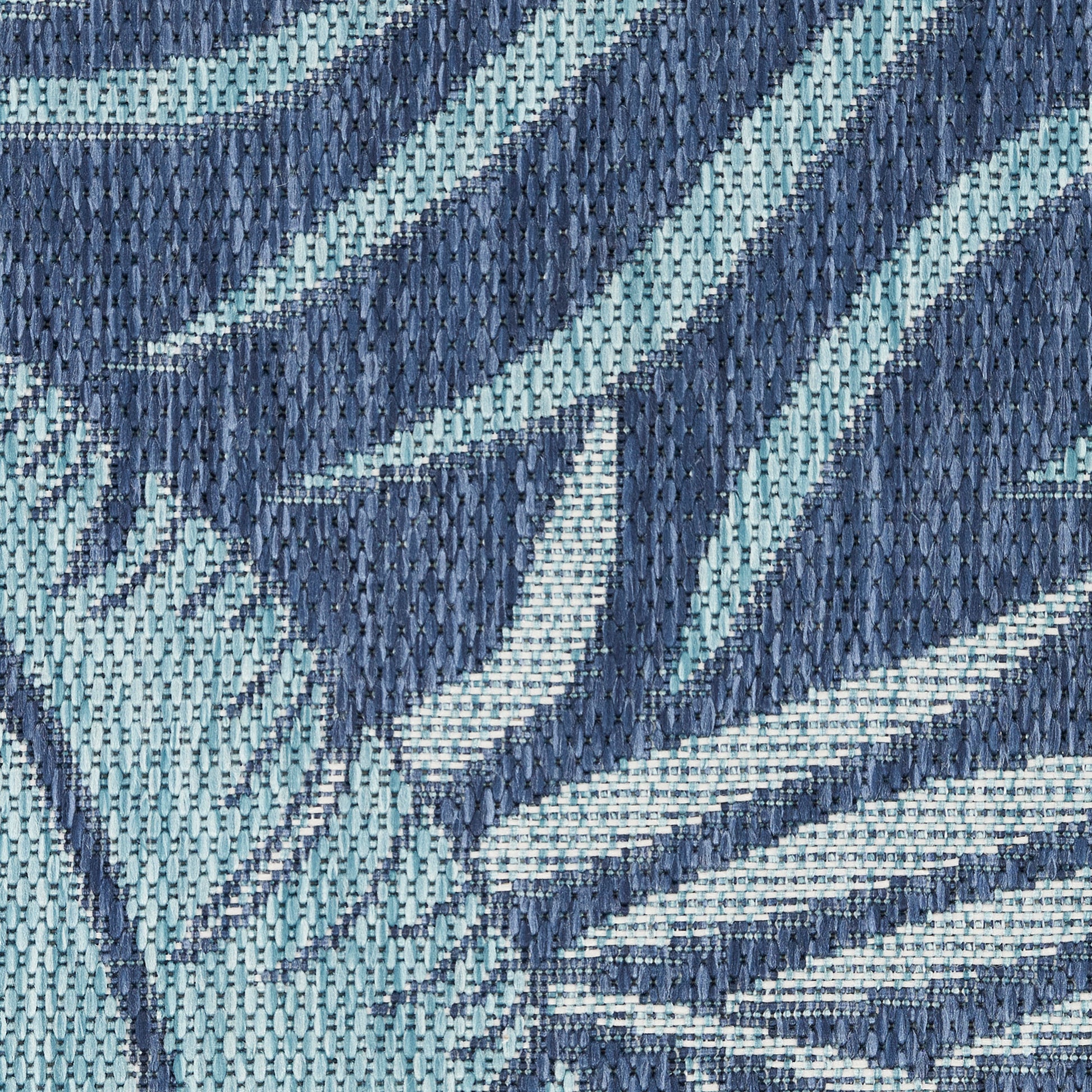 Enjoy vacation vibes from the comfort of your backyard with this navy-blue outdoor rug from the Garden Oasis Collection. The oversized tropical leaf pattern evokes feelings of lounging by the beach, with subtle tonal variations that add rhythmic appeal. Machine-made from polypropylene yarns for lasting style and all-weather performance, this flatweave rug is great for both indoor and outdoor spaces. Hand washable outdoors: rinse with a hose and air dry.