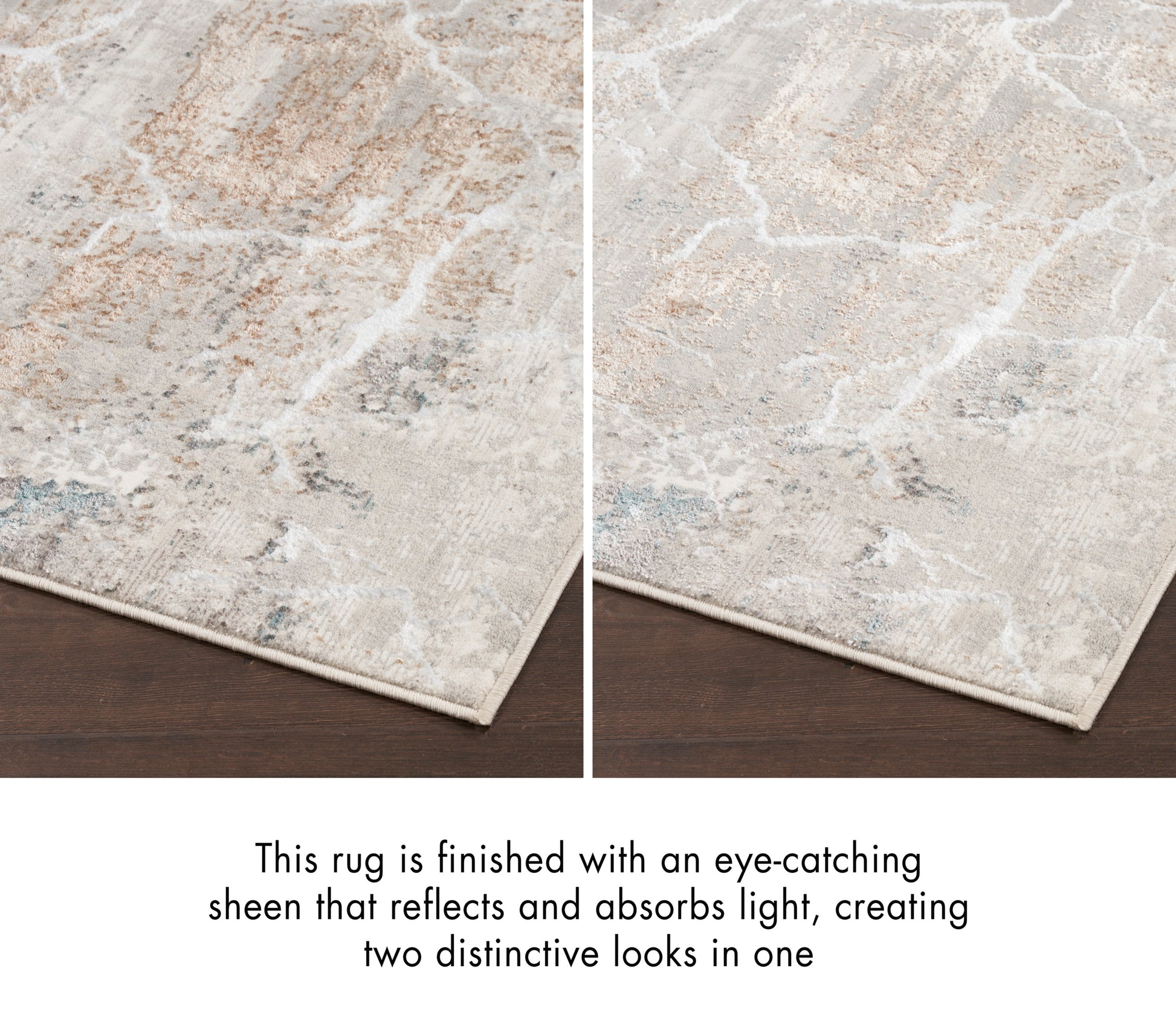Infuse sophisticated style into your living room, dining room, kitchen, or bedroom with this abstract grey rug from the Glitz Collection. The hazy, marble-like design adds a refined look made brilliant by shimmering accents that shift in color with changes in light. Machine-made from softly textured polyester in a short pile that’s easy to maintain, especially in busy households with pets and kids.
