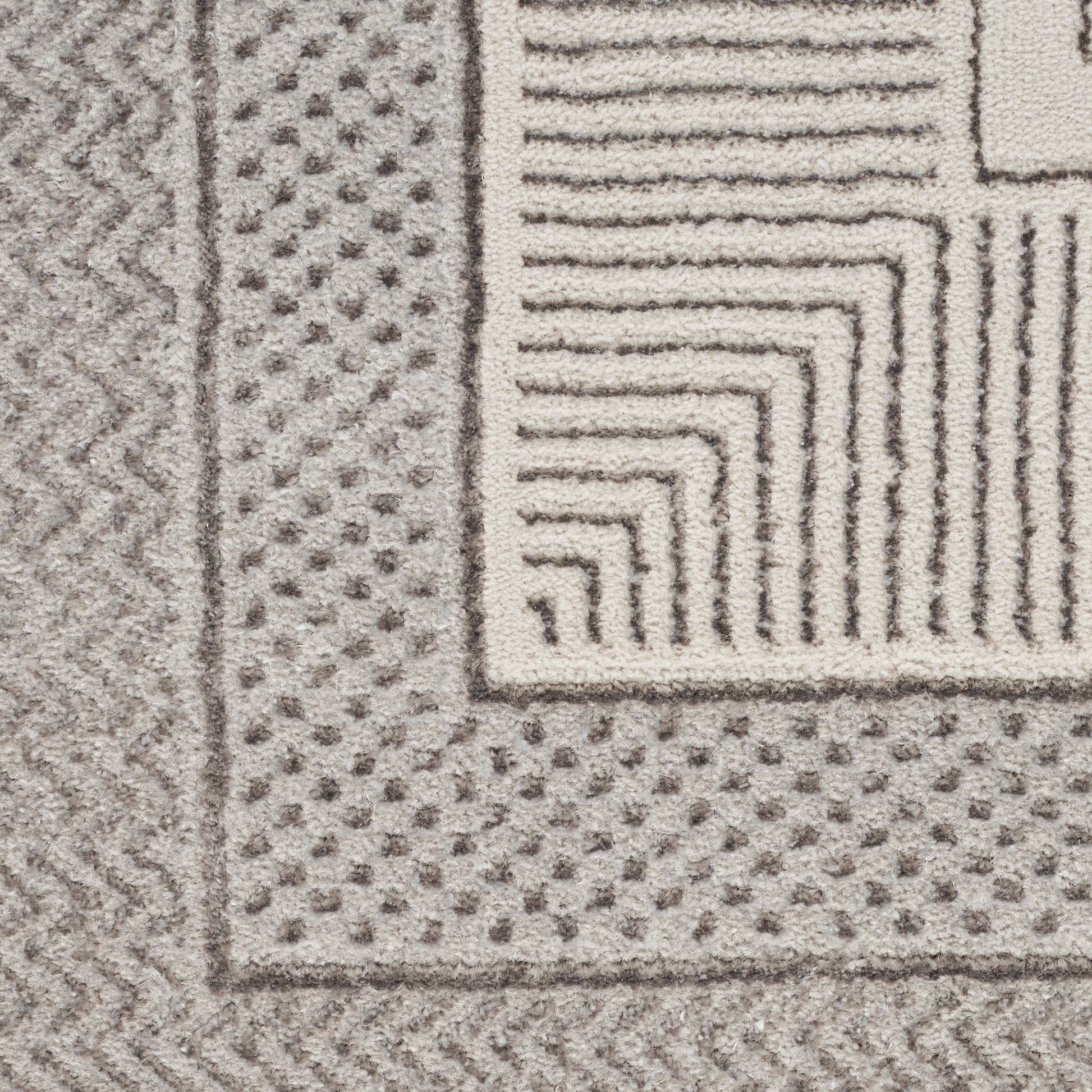 Create an ultra-glam foundation for your décor with this geometric rug from the Glitz Collection. It features an abstract center design surrounded by a series of wide and narrow borders in silver tones that are enhanced with subtly textured accents. Finished with a brilliant shimmer that adds visual intrigue, this contemporary rug is made from softly textured polyester.