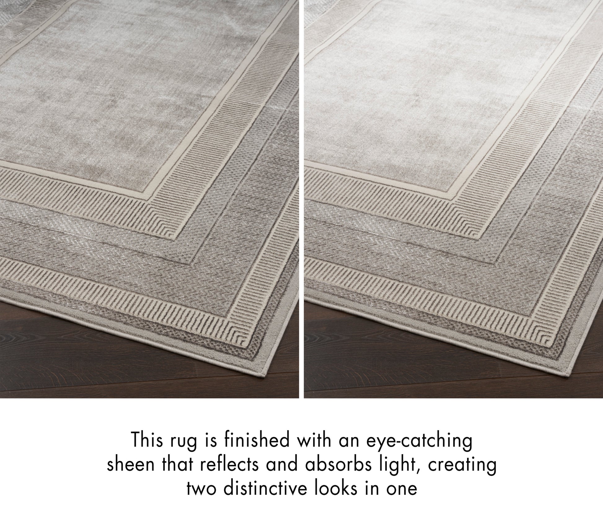 Create an ultra-glam foundation for your décor with this geometric rug from the Glitz Collection. It features an abstract center design surrounded by a series of wide and narrow borders in silver tones that are enhanced with subtly textured accents. Finished with a brilliant shimmer that adds visual intrigue, this contemporary rug is made from softly textured polyester.