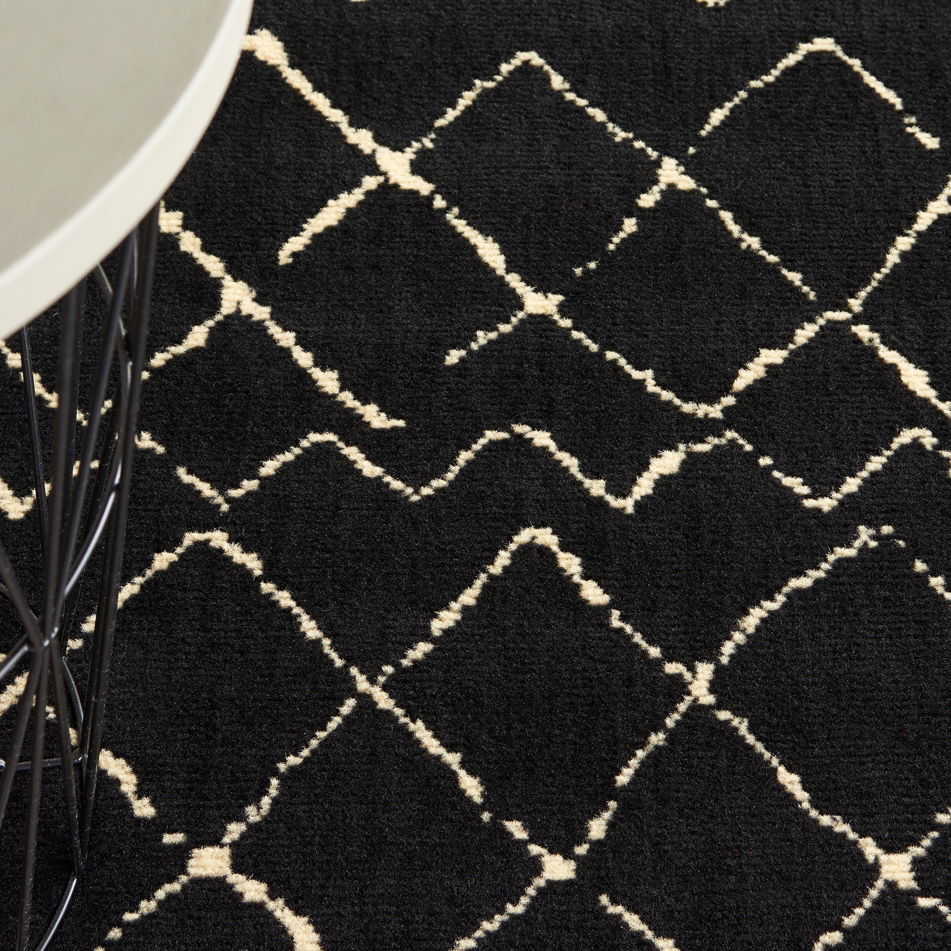 Playful and primitive, this Grafix area rug from Nourison features distressed cream-colored tribal rug patterns on a sumptuous black field. Each rug is power-loomed for simple care, superior wear and a splendid look and feel, and will transform even the most ordinary room into something extraordinary.