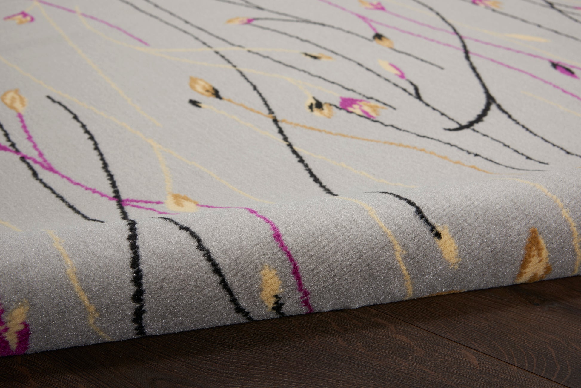 This Grafix area rug from Nourison features a gracefully flowing floral design in profound shades of grey, cream, crimson and blue to impart a stunning and sophisticated simplicity to any room where it resides.