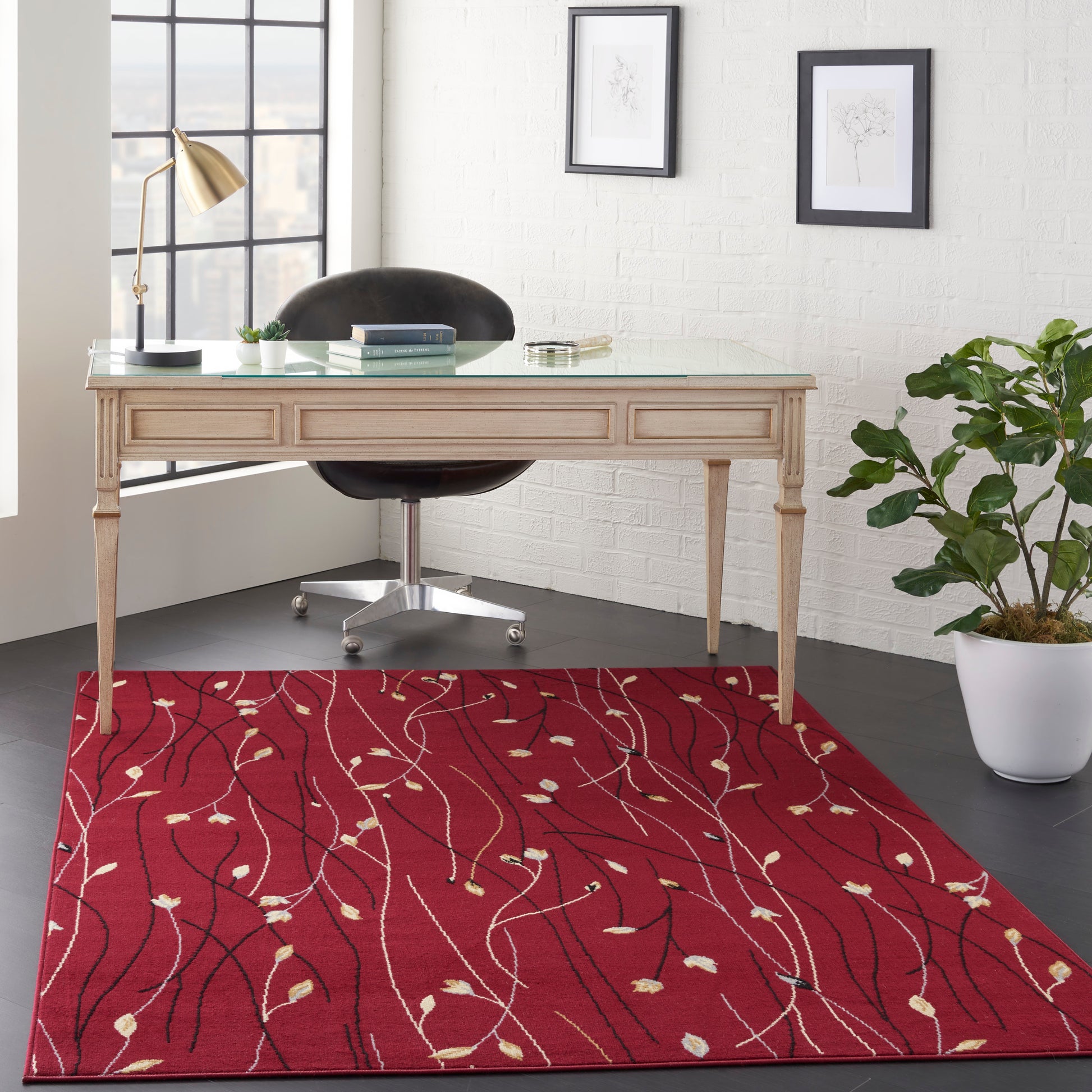 This Grafix area rug from Nourison features a gracefully flowing floral design in riveting shades of red, grey, cream and blue to impart a stunning and sophisticated simplicity to any room where it resides.