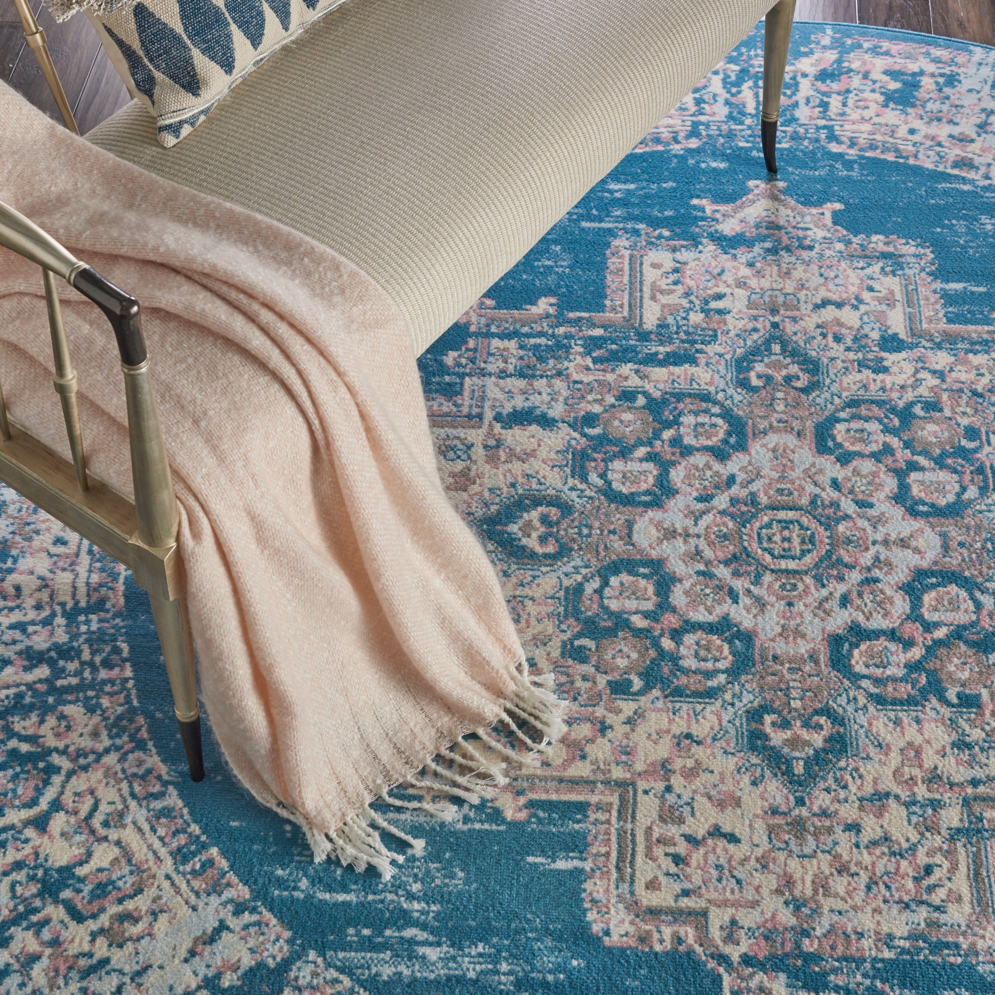 In soothing shades of blue and ivory with subtle pink accents, this brilliantly-bordered, central medallion Grafix area rug from Nourison will elevate the elegance quotient of any room. Masterfully power loomed from silky and ultra-hardy polypropylene for a lavish feel, long wear, and low maintenance.