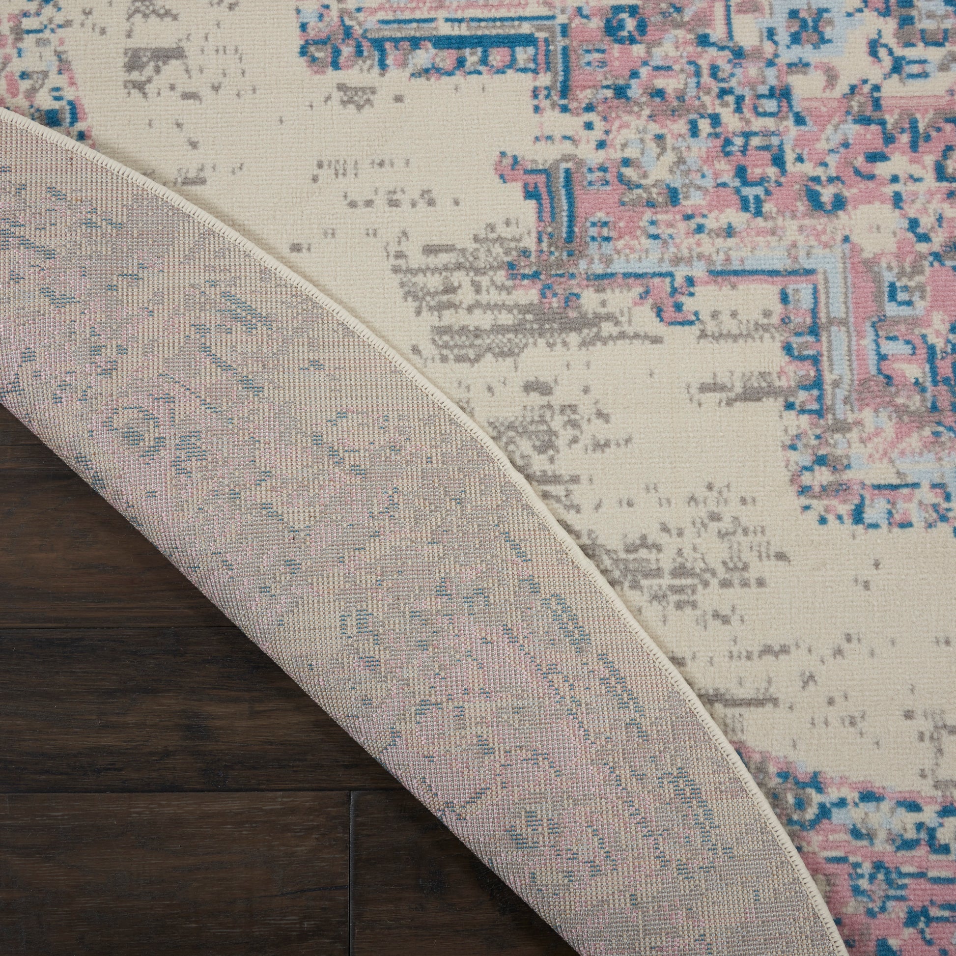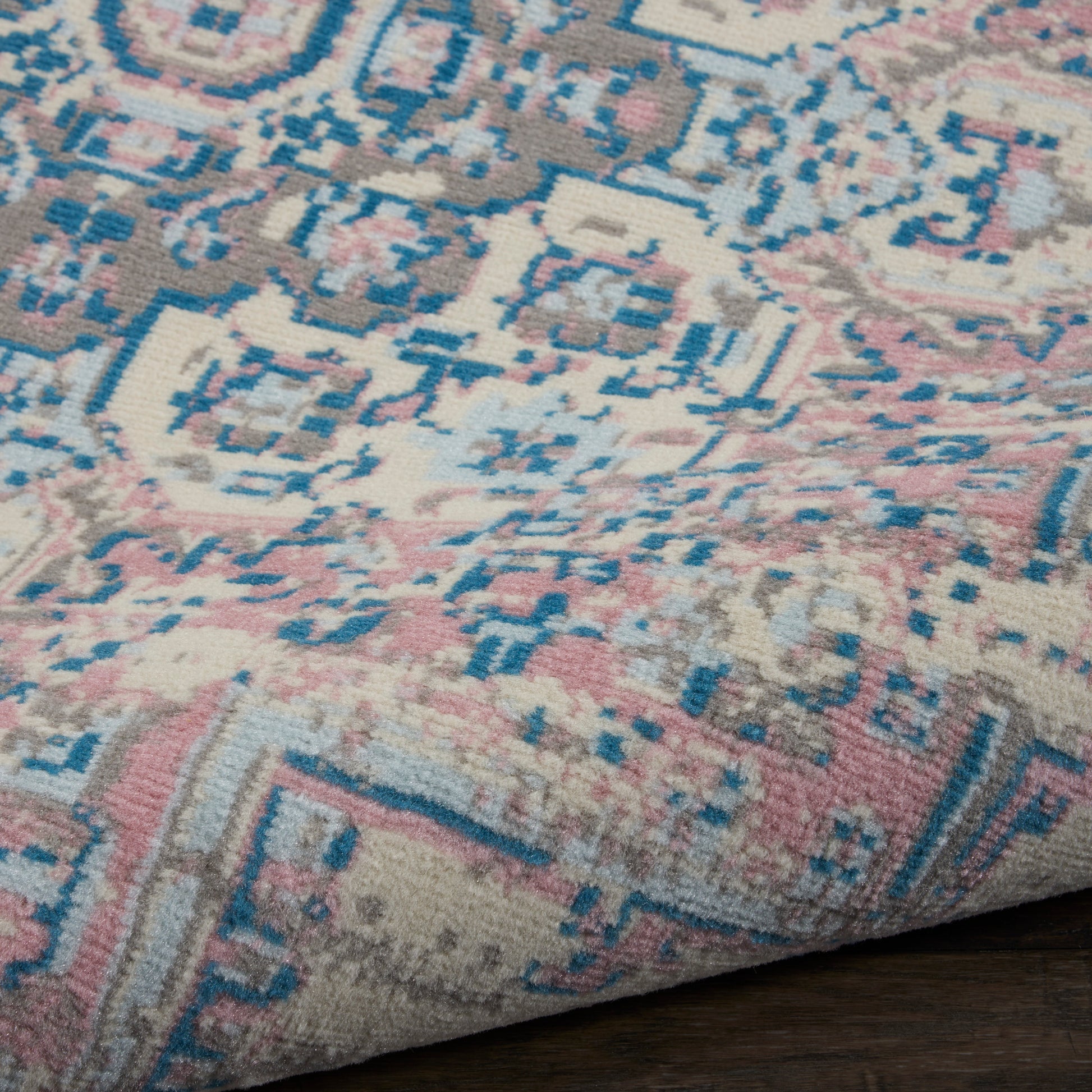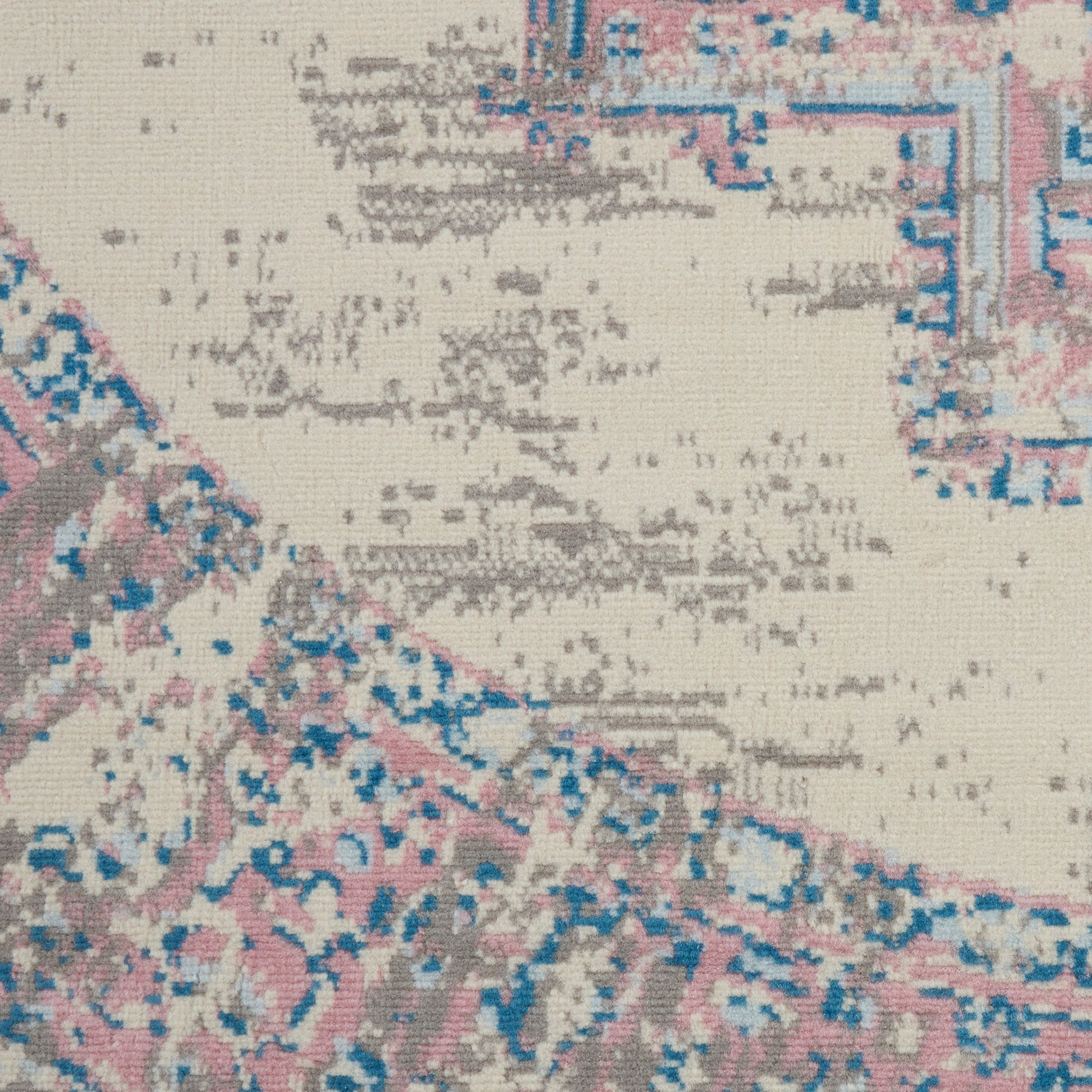 In soothing shades of pink and ivory with subtle blue accents, this brilliantly-bordered, central medallion Grafix area rug from Nourison will elevate the elegance quotient of any room. Masterfully power loomed from a silky and ultra-hardy polypropylene for a lavish feel, long wear, and low maintenance.