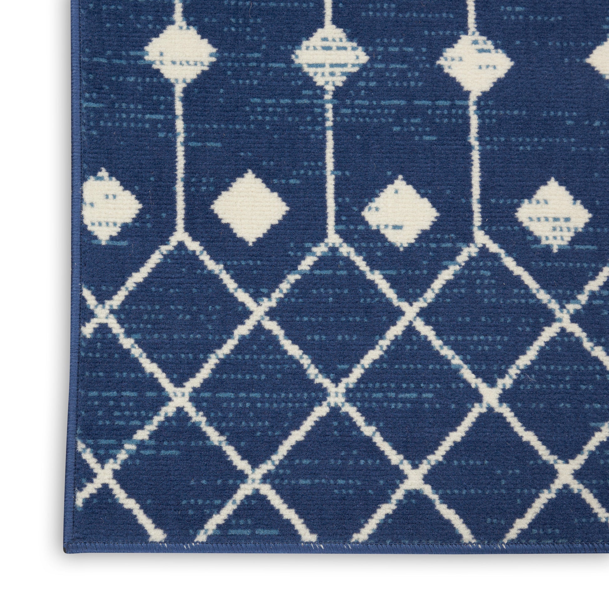 The Moroccan diamond bead pattern of this Grafix area rug creates a dimensional op-art look that draws the eye and pulls a room together. The contrast of blue and ivory creates a stunning focal point for the contemporary home.