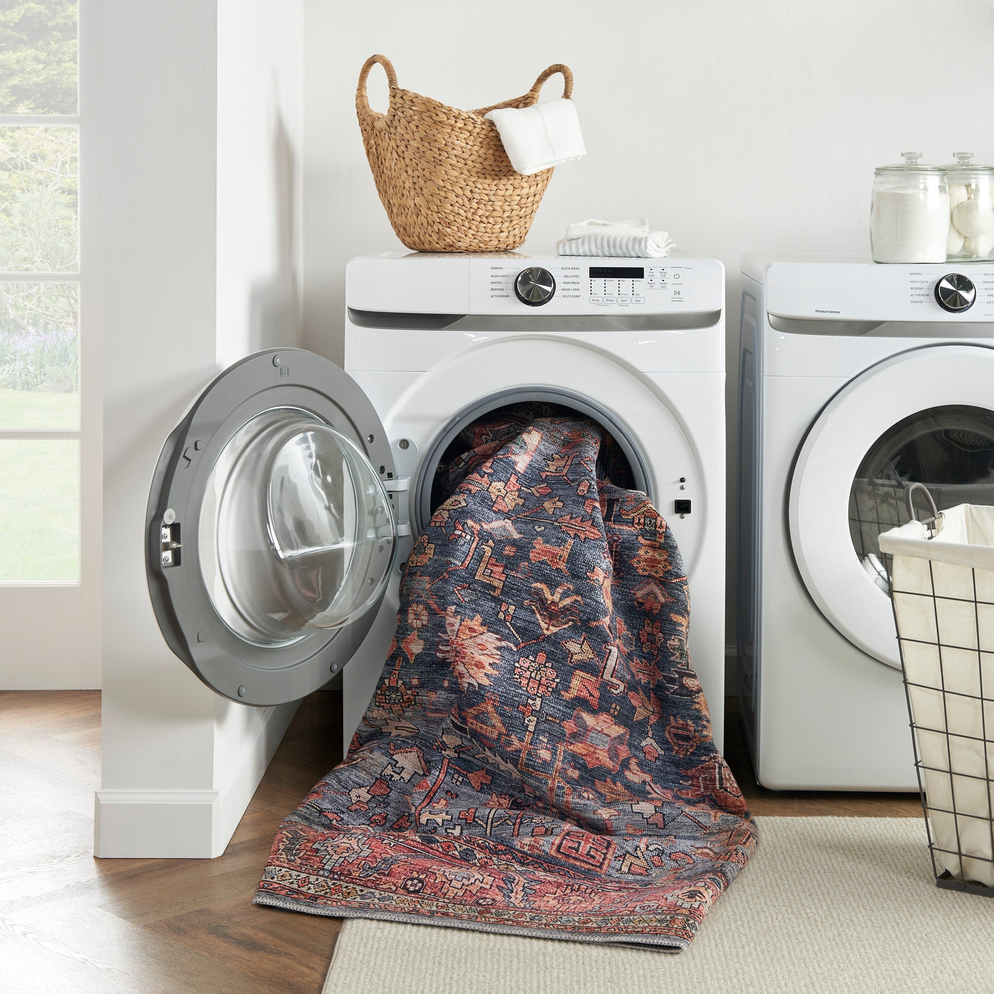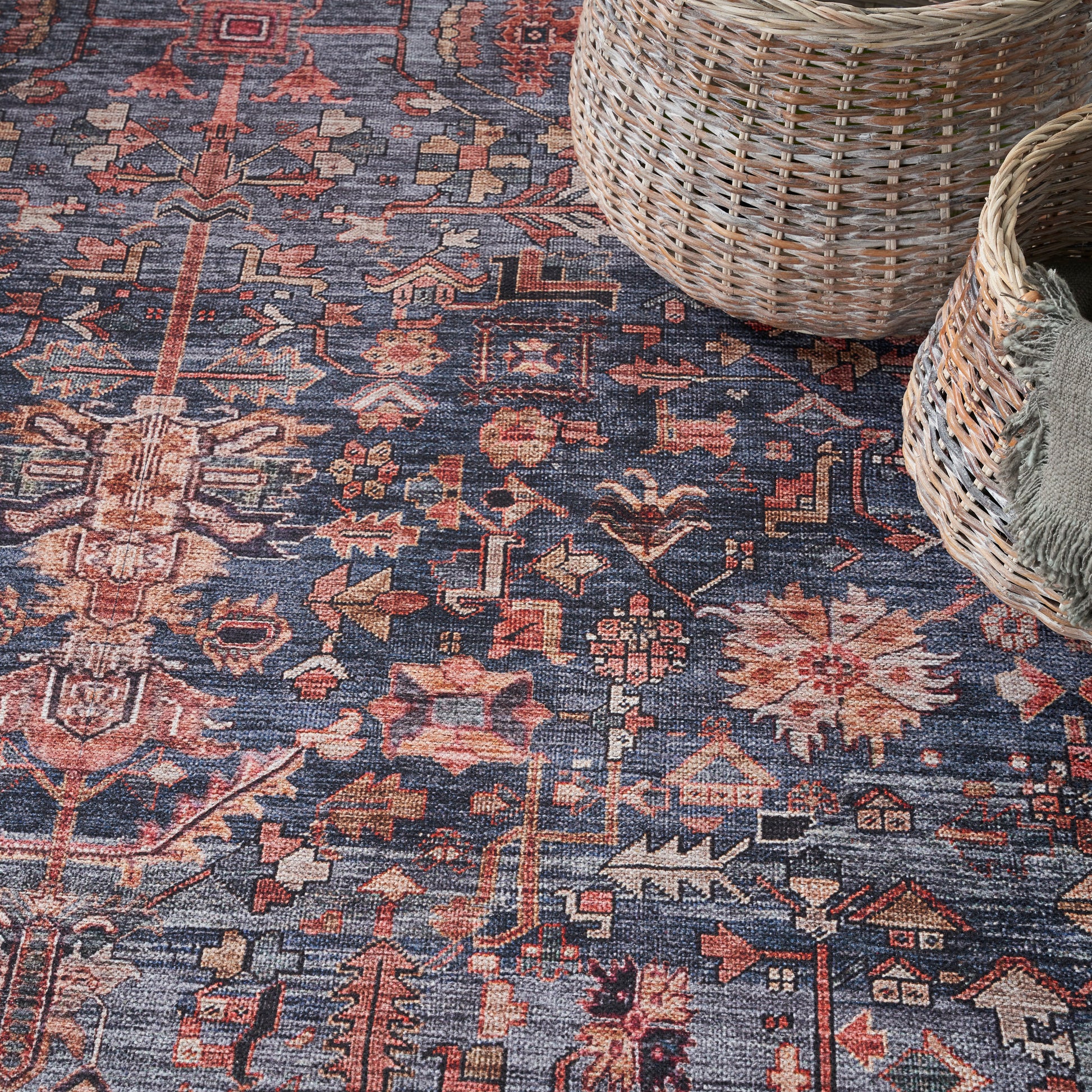 Bring the timeless appeal of yesteryear to your home with this washable rug from the Grand Washables Collection. The richly saturated navy-blue ground is framed by a brick red border finished with a vintage wash that adds a subtle pop of color to your living room or bedroom. This Printed Persian rug is thoughtfully designed for busy households, with a flatwoven pile and non-slip back that offers durability and easy cleaning without sacrificing style: simply toss into a washing machine.