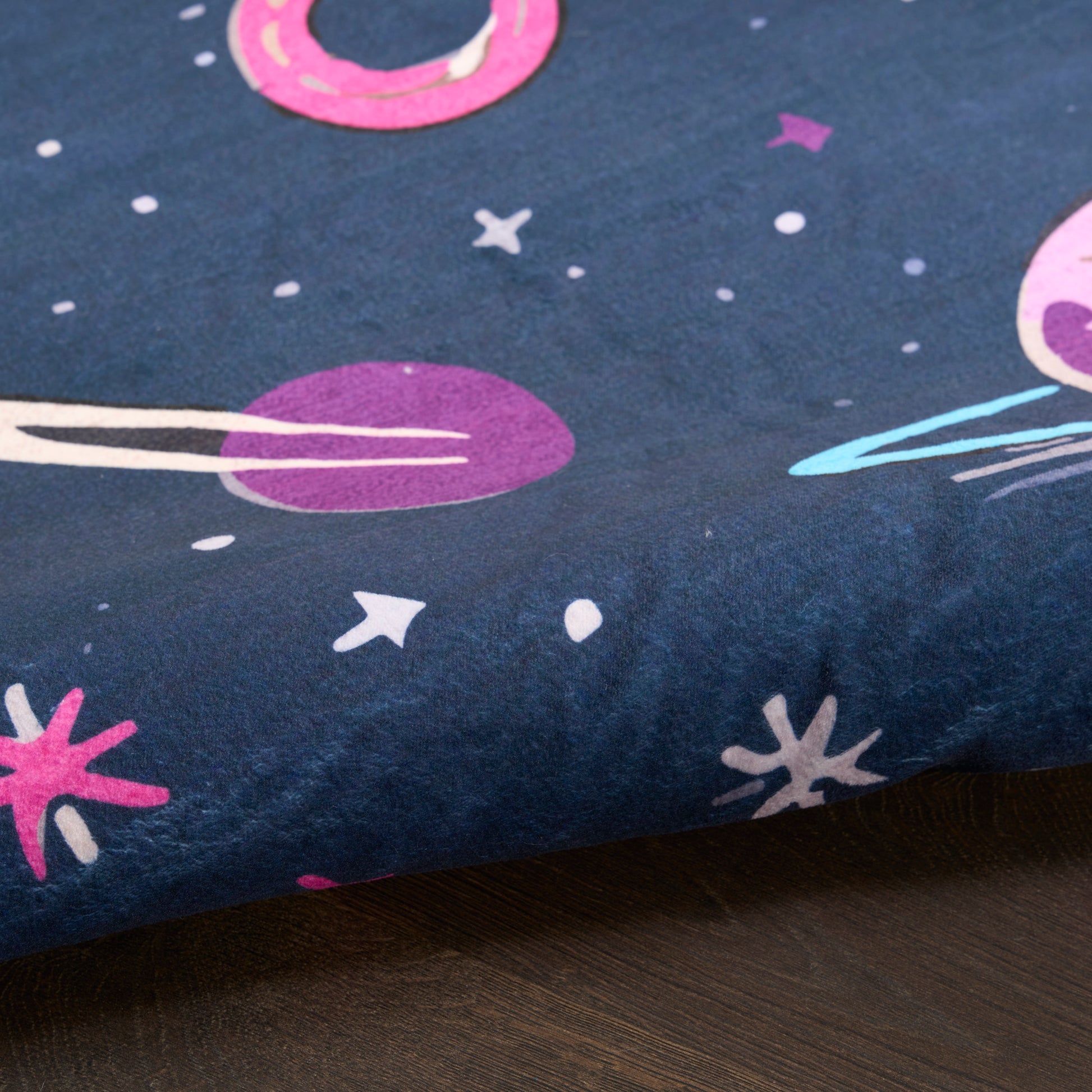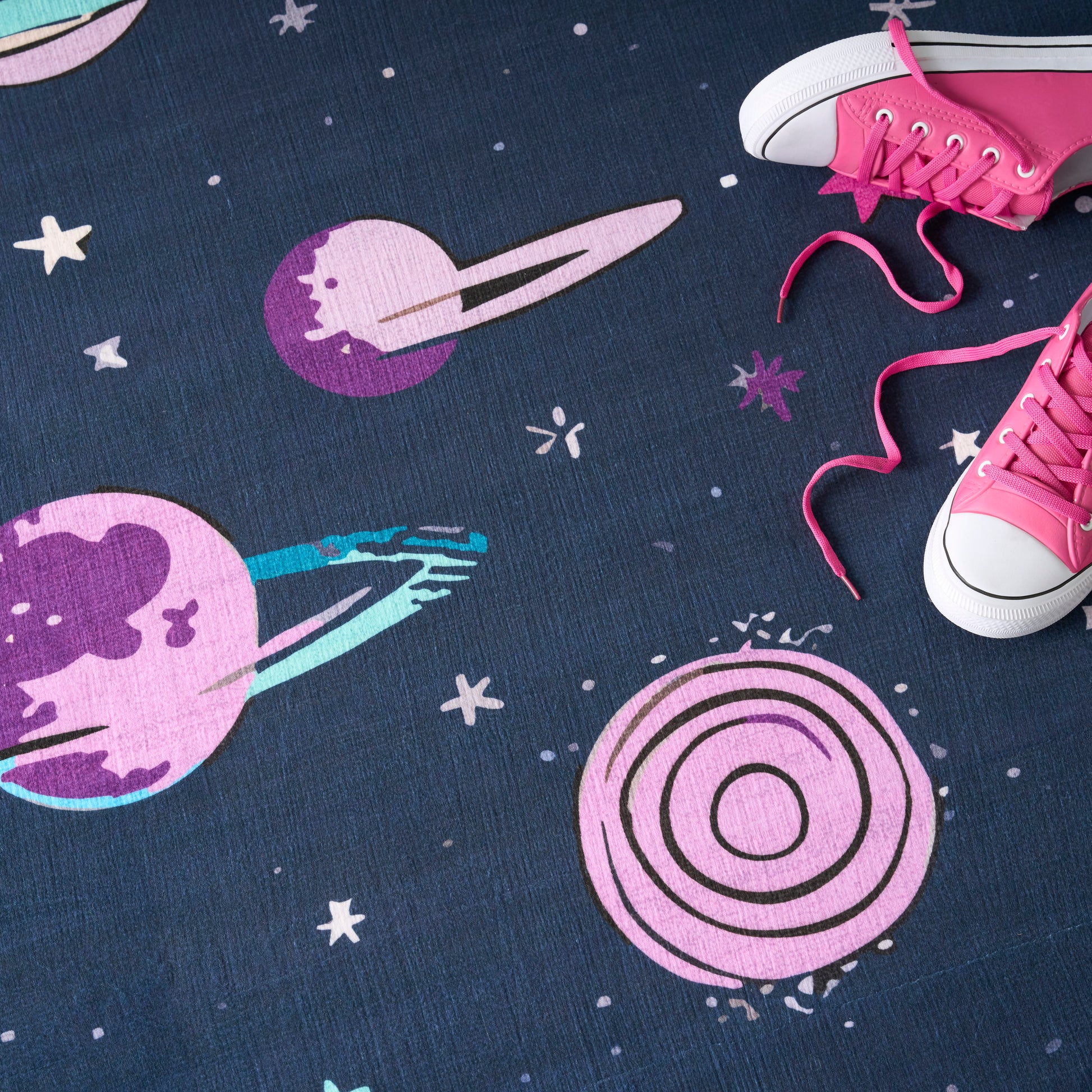 Inspire a love for the cosmos with this space-themed kids’ rug from the Imagination collection. The dark background brings out the charm of the printed purple and blue planetary scene, making this rug perfect for aspiring astronauts. This rug is machine washable with a soft polyester construction and non-skid backing.
