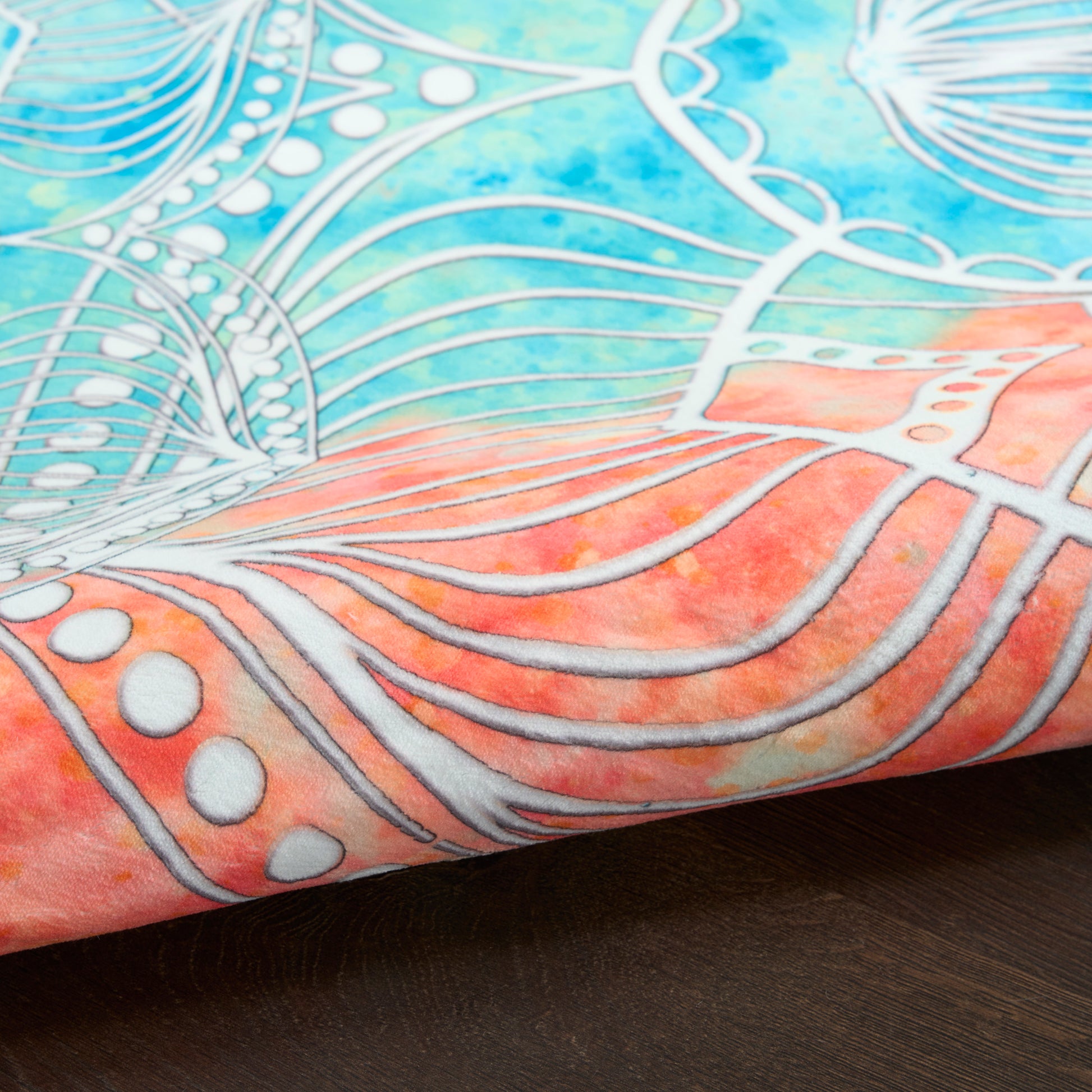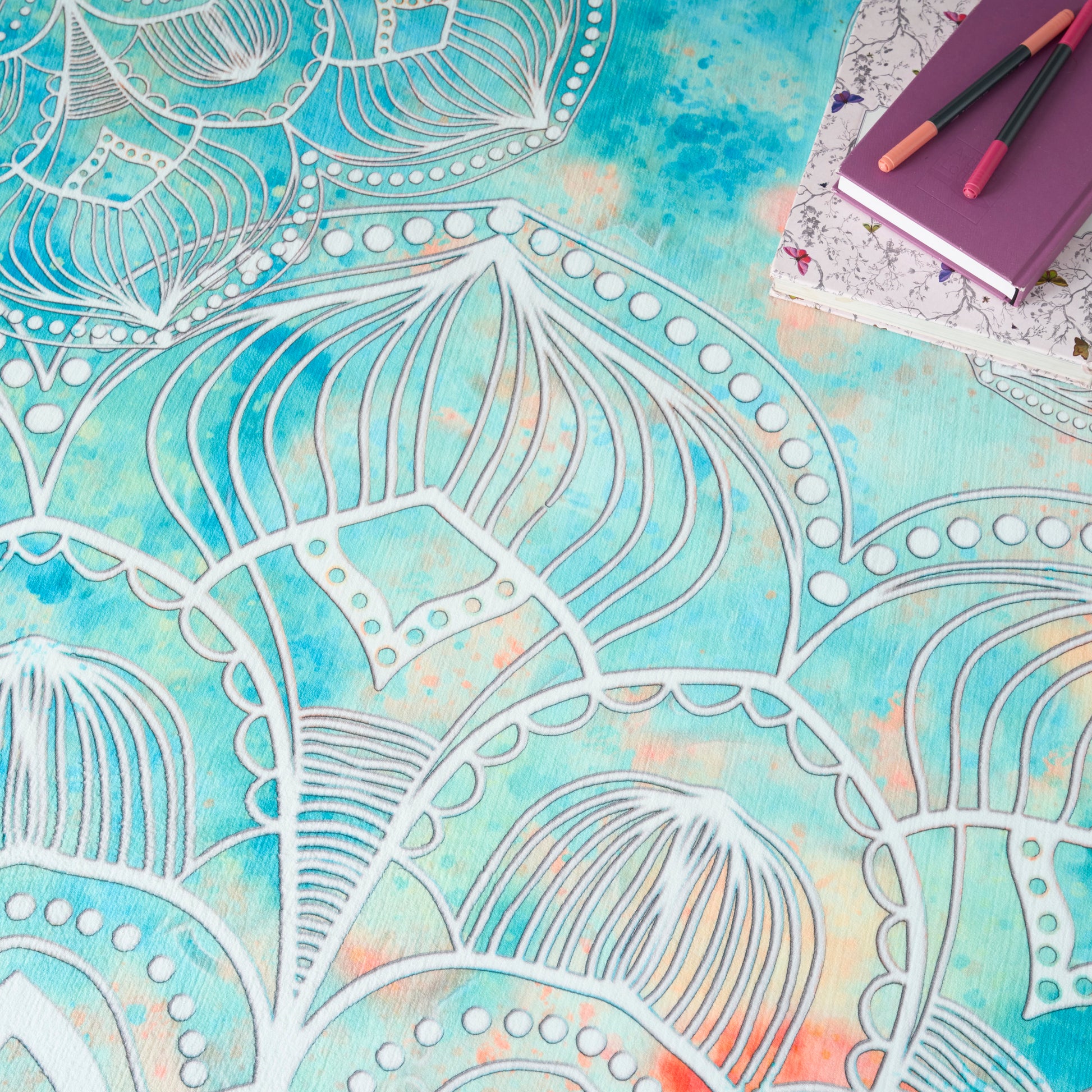 Transform your child’s room into a serene, creative space with this kids’ boho rug from the Imagination collection. The printed mandala pattern, printed in soothing teal and cream tones, inspires peace and calm. This washable rug is made from polyester with a non-skid backing for soft comfort and security.
