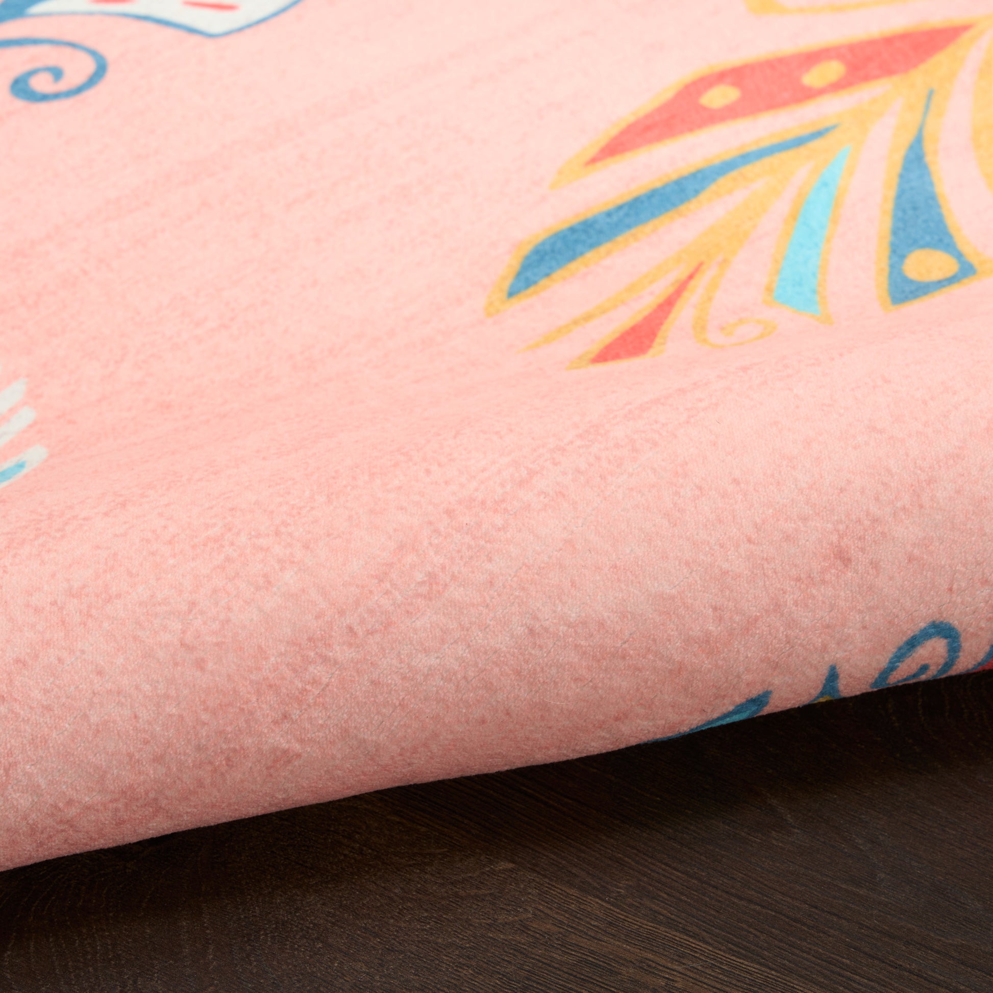 Add a touch of whimsy to your child’s room with this kids’ rug from the Imagination collection. The printed surface features colorful feathers that float gracefully across a warm peach background, creating a light and airy vibe. This rug is machine washable with a soft polyester construction and non-skid backing, making it both fun and functional.