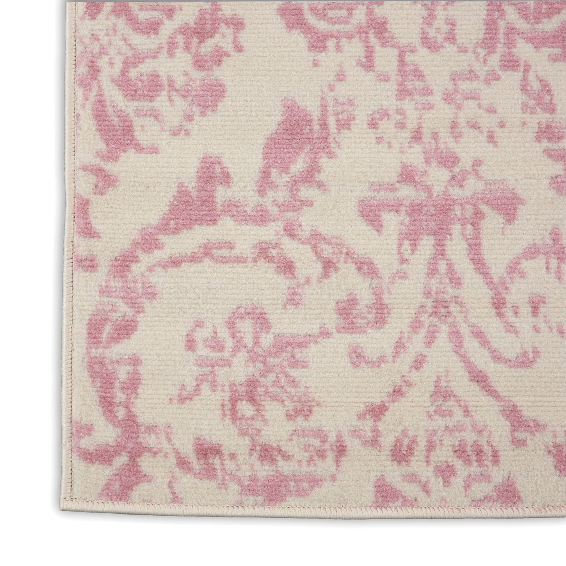 Dramatically distressed color effects and ornate European damask designs bring a vintage antique vibe to this Jubilant Collection area rug. Striated pink patterns on an ivory white field bring an authentic elegance to your favorite room, with a sleek low pile of easy-care fibers.