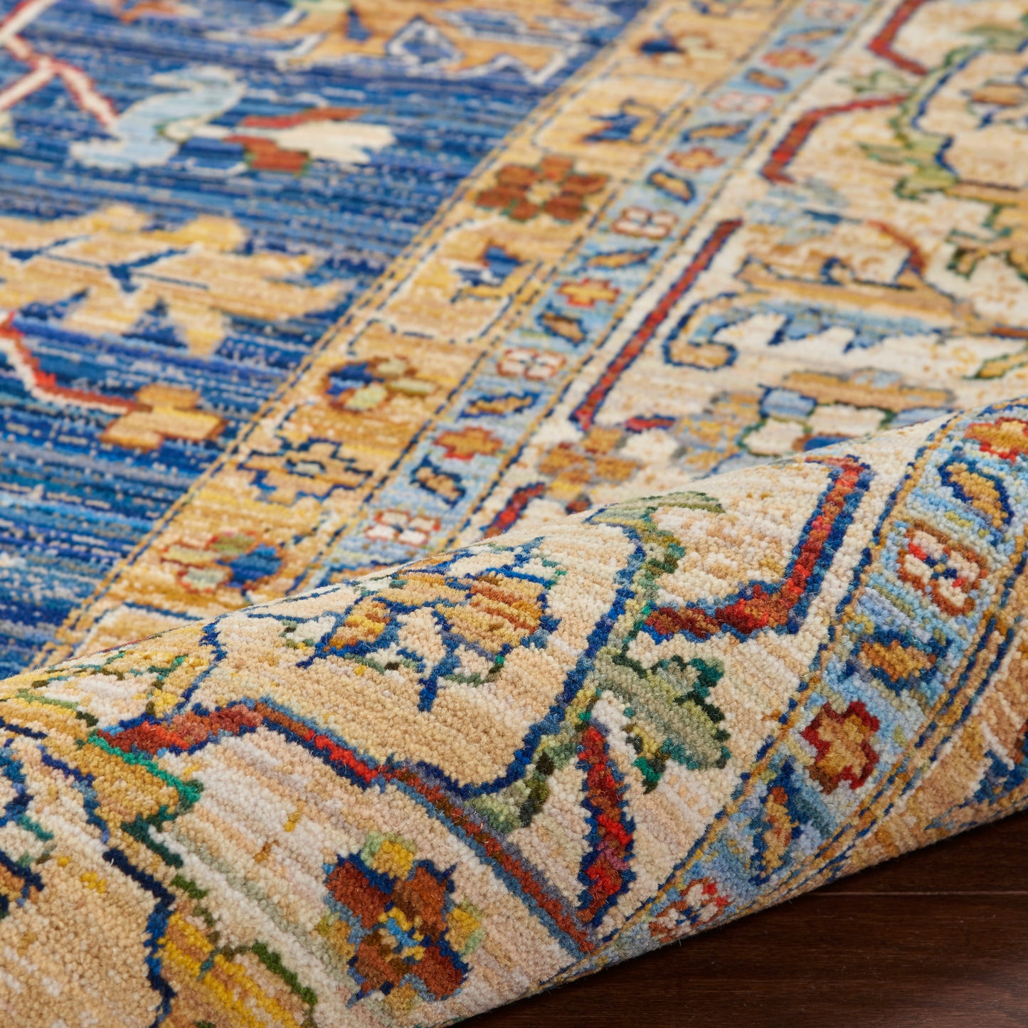 This dramatic bordered rug features bold Oushak-influenced designs with an undersized center medallion in gold, red, and cream, on an abrash blue field. Thick, luxurious cut pile from wool and nylon create the look and feel of a vintage rug that will bring elegance and excitement to any room in the home.