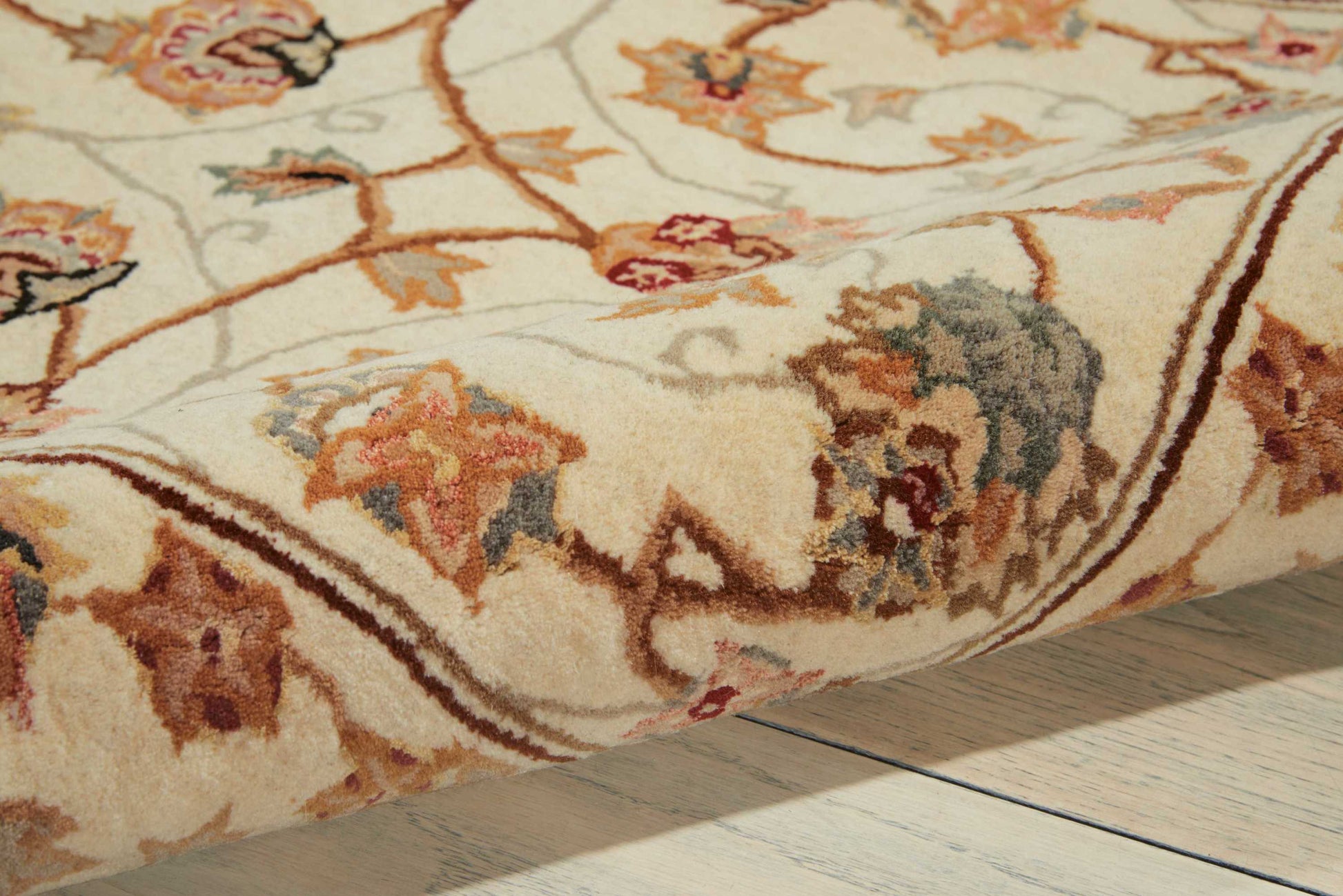 This luxurious tapestry of scrolling vines and stylized flowerheads, bordered by detailed palmettes, makes a statement of tasteful artistry in elegant ivory. Its thick, lustrous pile and warm neutral colors bring harmony into the home.