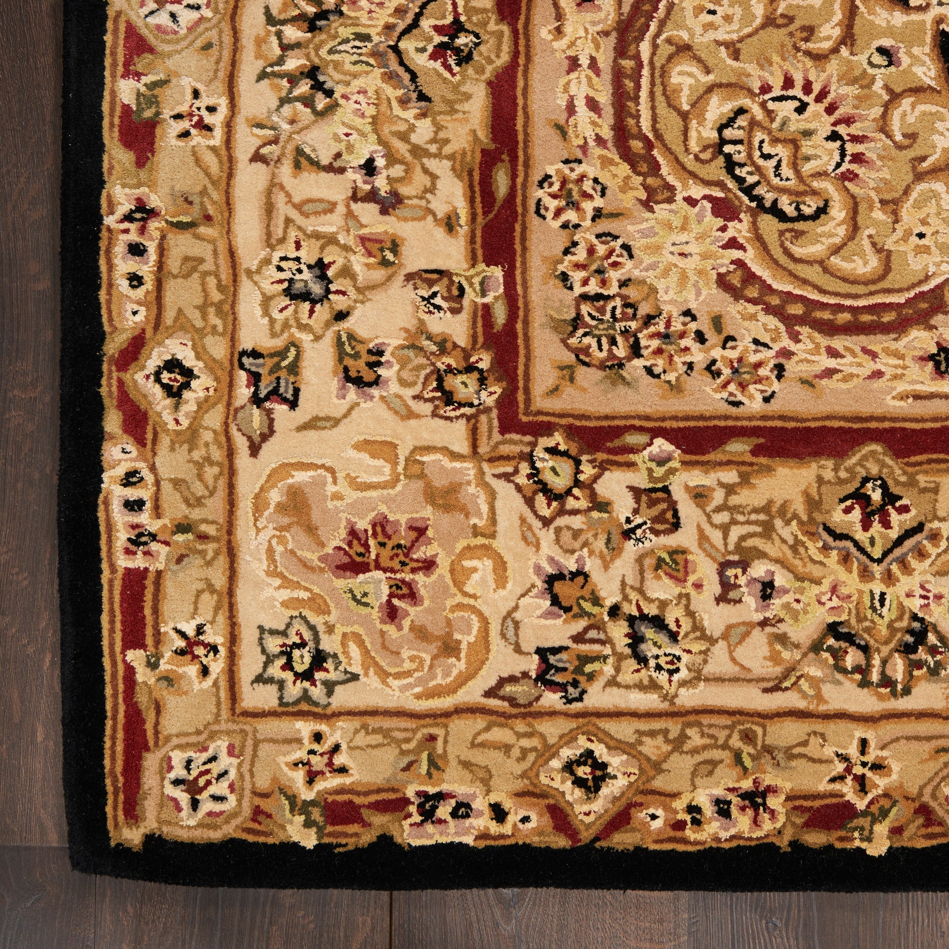 Like an ancient mandala, the concentric effect of this traditional Persian pattern draws you into a contemplative mood. Ruby reds contrasted with rich ebony and golden beige sparkle within the delicate, expanding framework of borderlines. The total effect is of rich magnificence.