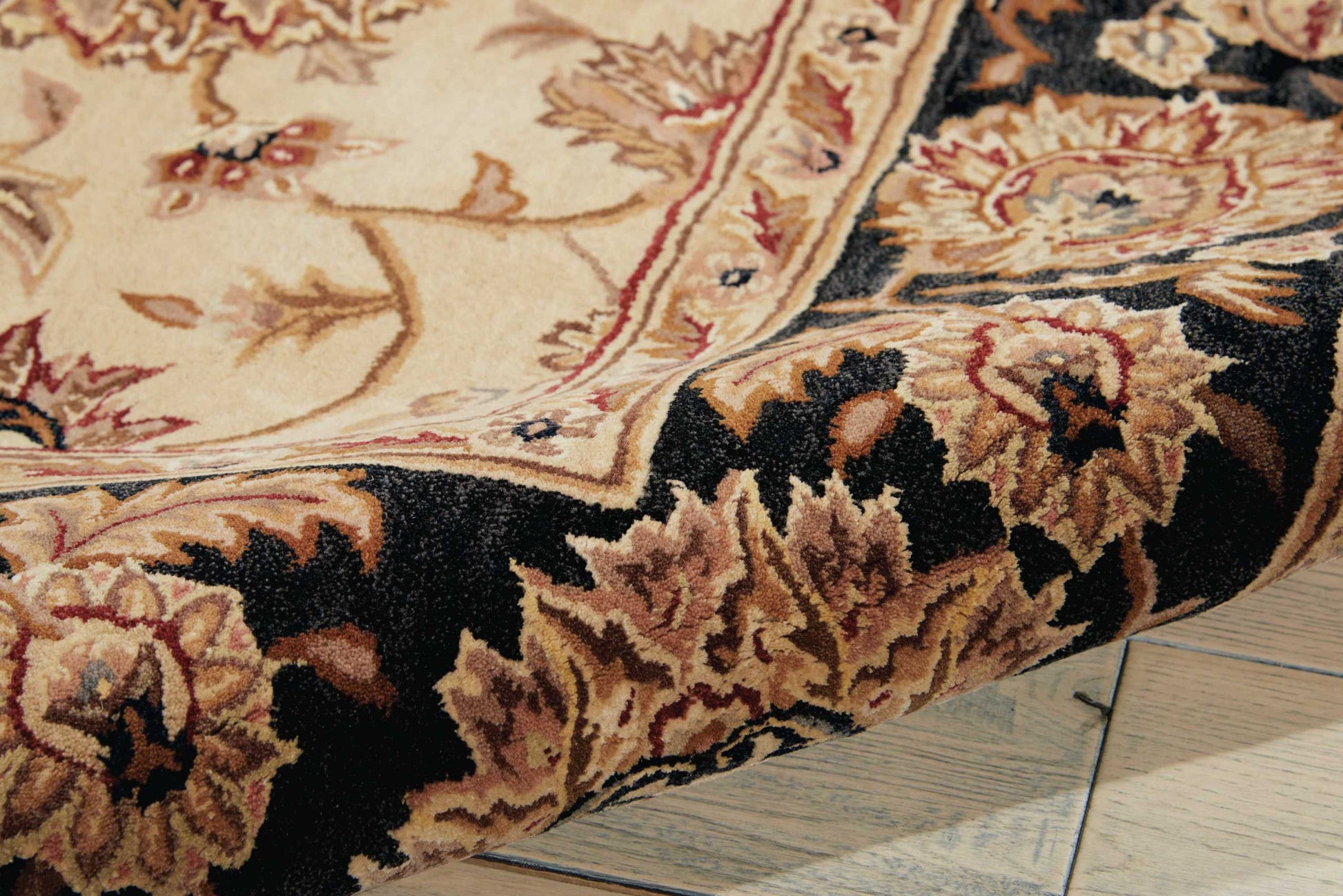 Pale parchment takes on dramatic life when contrasted by an ebony black border in this delicate yet dynamic Persian-influenced design. Stylized flowers burst into bloom and create a sense of pulsating energy that makes a room come to life. Enjoy the sensual beauty of its thick, lush pile.