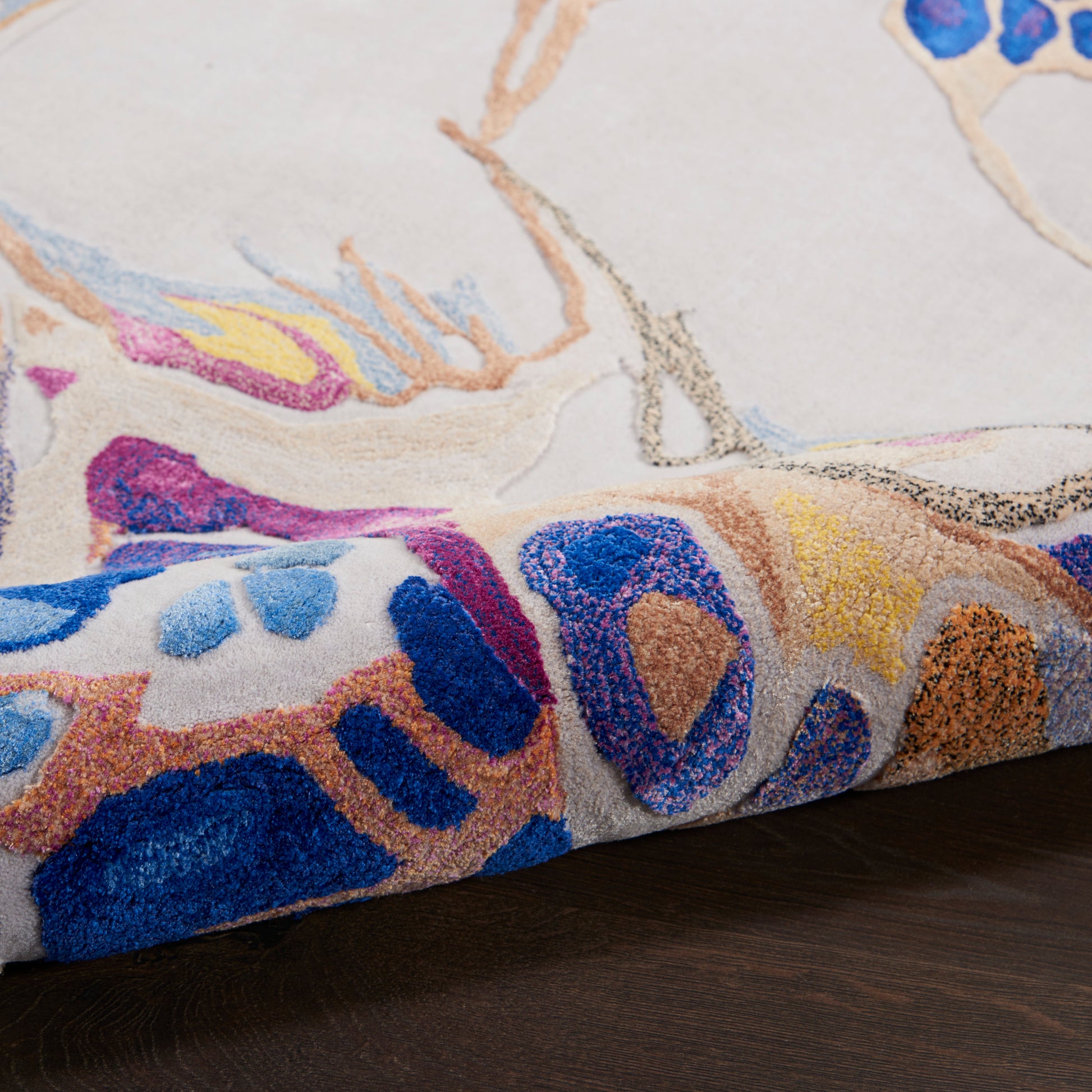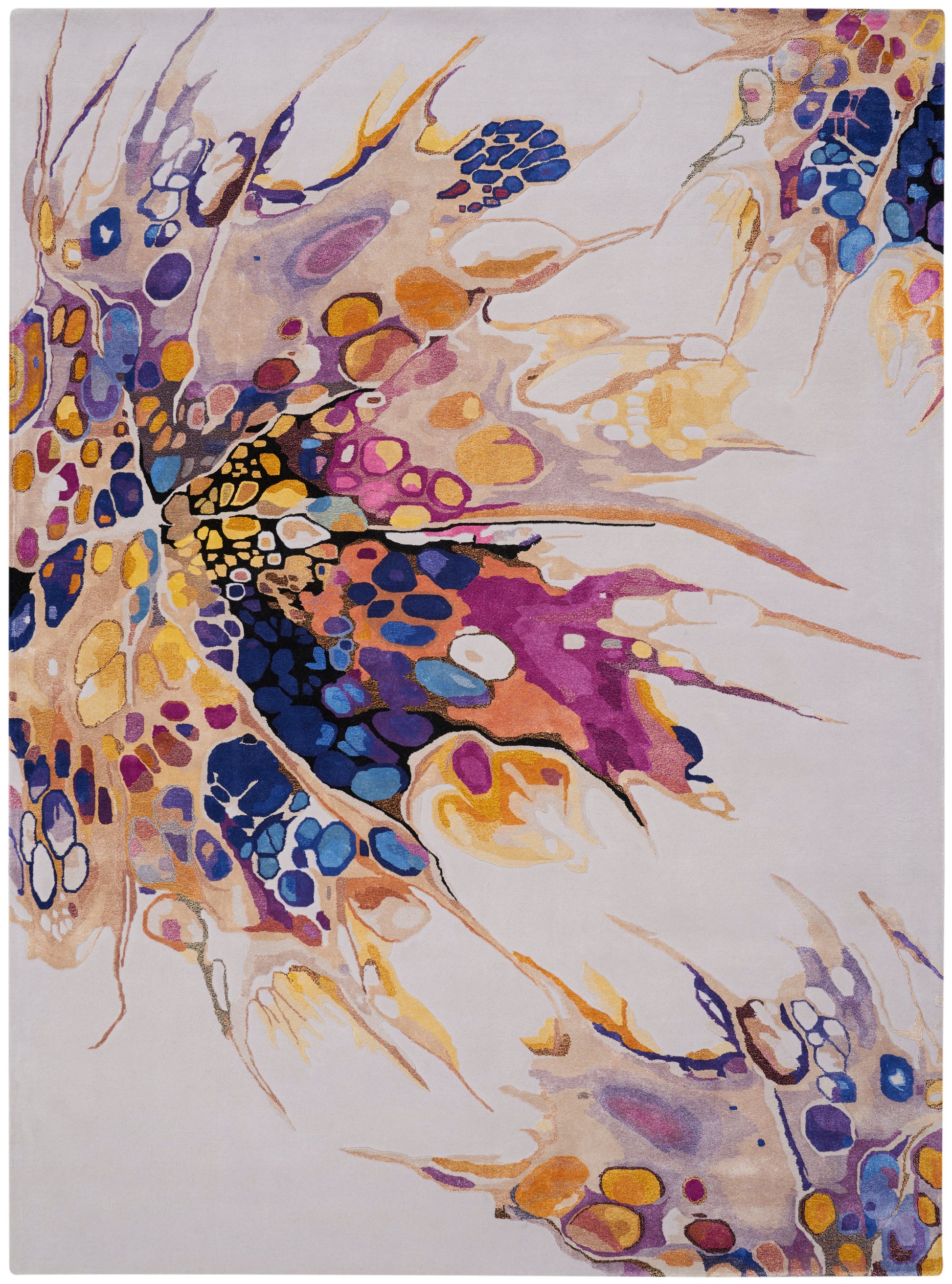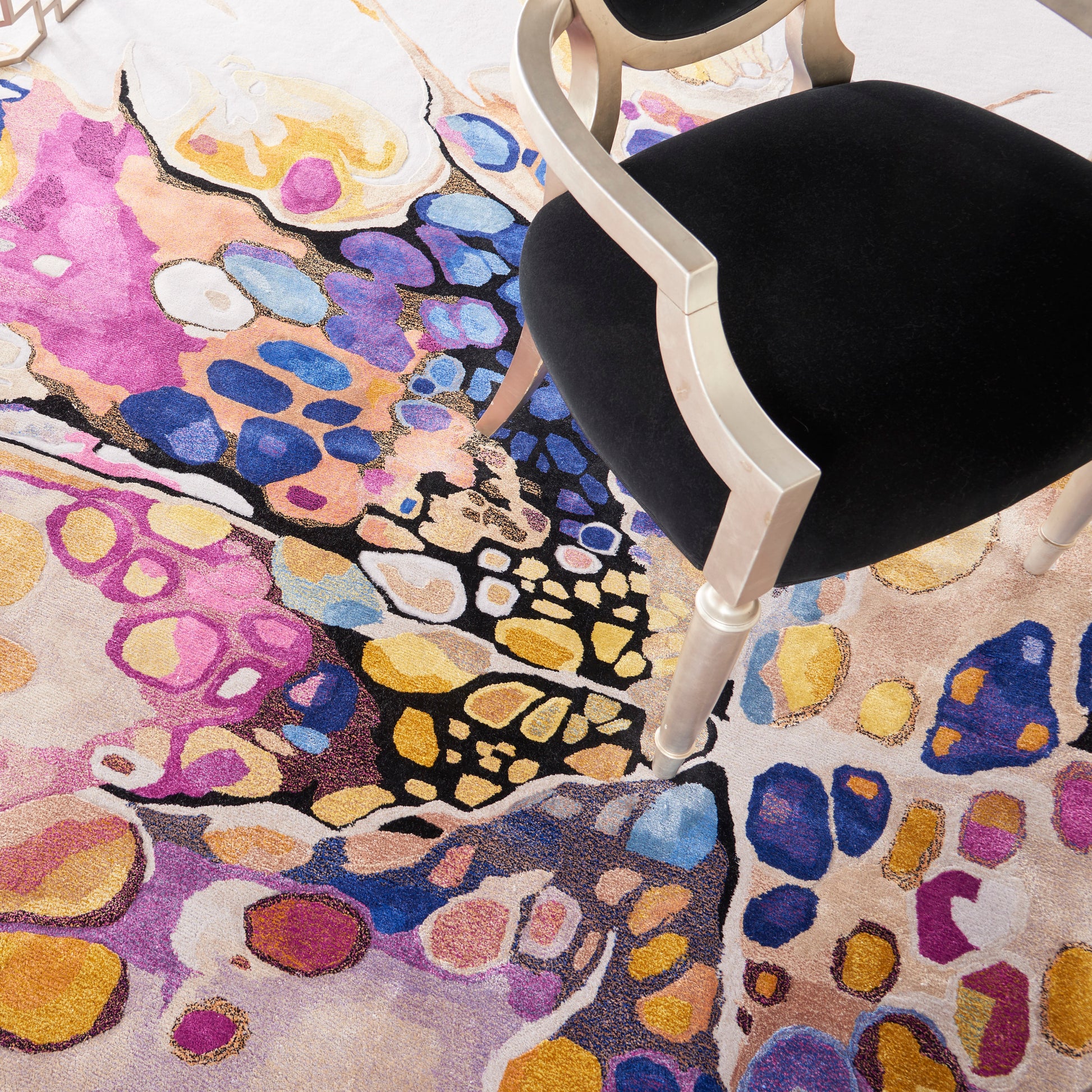 Captivatingly vivid color seems to splash across the surface of this sensational Prismatic area rug. The abstract design hints at floral motifs and natural forms, in a beautifully balanced and painterly rug. The luxurious blend of wool and shimmering, silk-like Luxcelle™ fibers adds to the beauty of its sophisticated palette in multicolor shades of grey, purple, gold, beige, blue, and yellow. This exceptionally soft, hand-tufted cut pile works beautifully in contemporary, modern, and eclectic décor.