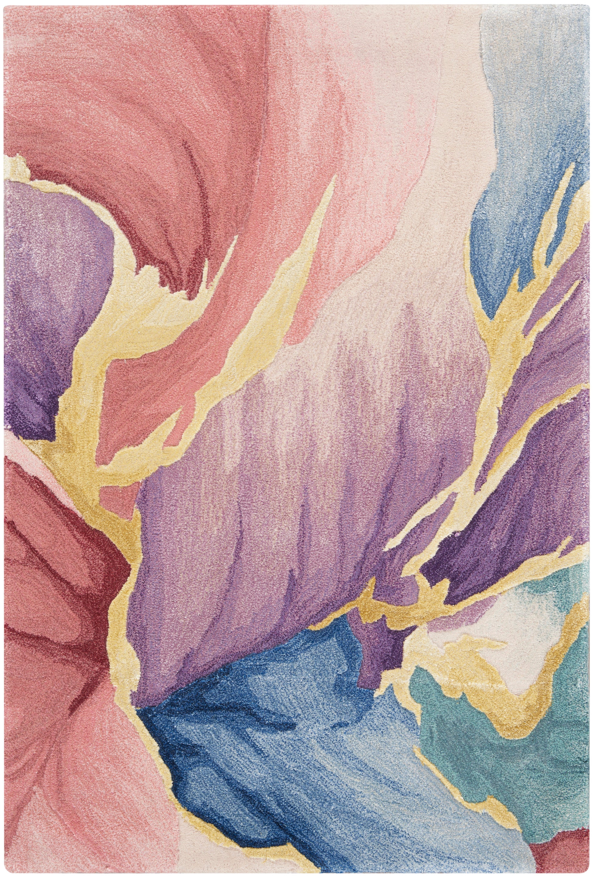 Bring mesmerizing style to your living room or bedroom with this abstract rug from the Prismatic Collection. Vibrant strokes of purple, blue, pink, and gold create movement across the solid ivory ground, which is enhanced with carved accents that add an eye-catching sense of depth. Handmade from a blend of premium New Zealand wool and silky Luxcelle™.