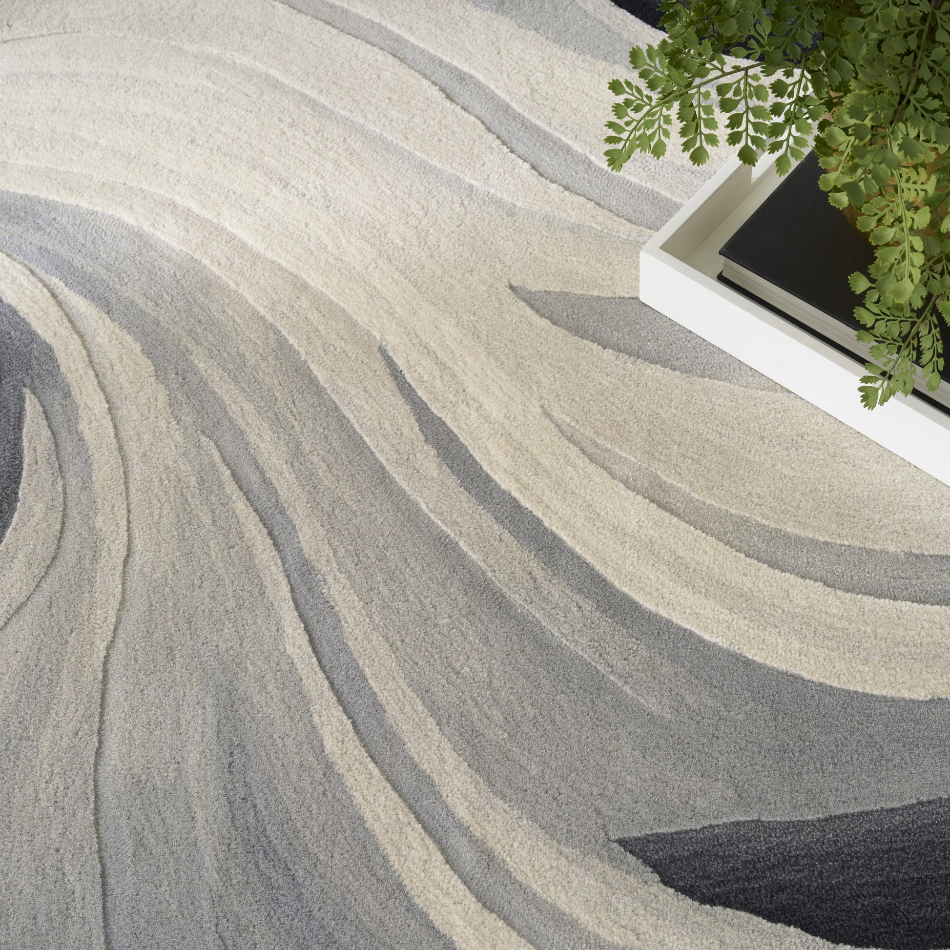 Bring any room to the forefront of avant-garde style with this abstract rug from the Prismatic collection. Swirling black, grey, and ivory tones create a deeply entrancing centerpiece, made even more stunning by a dimensional hand-carved finish. Handmade from a blend of New Zealand wool and silk-like Luxcelle™ fibers that beautifully capture changes in light.