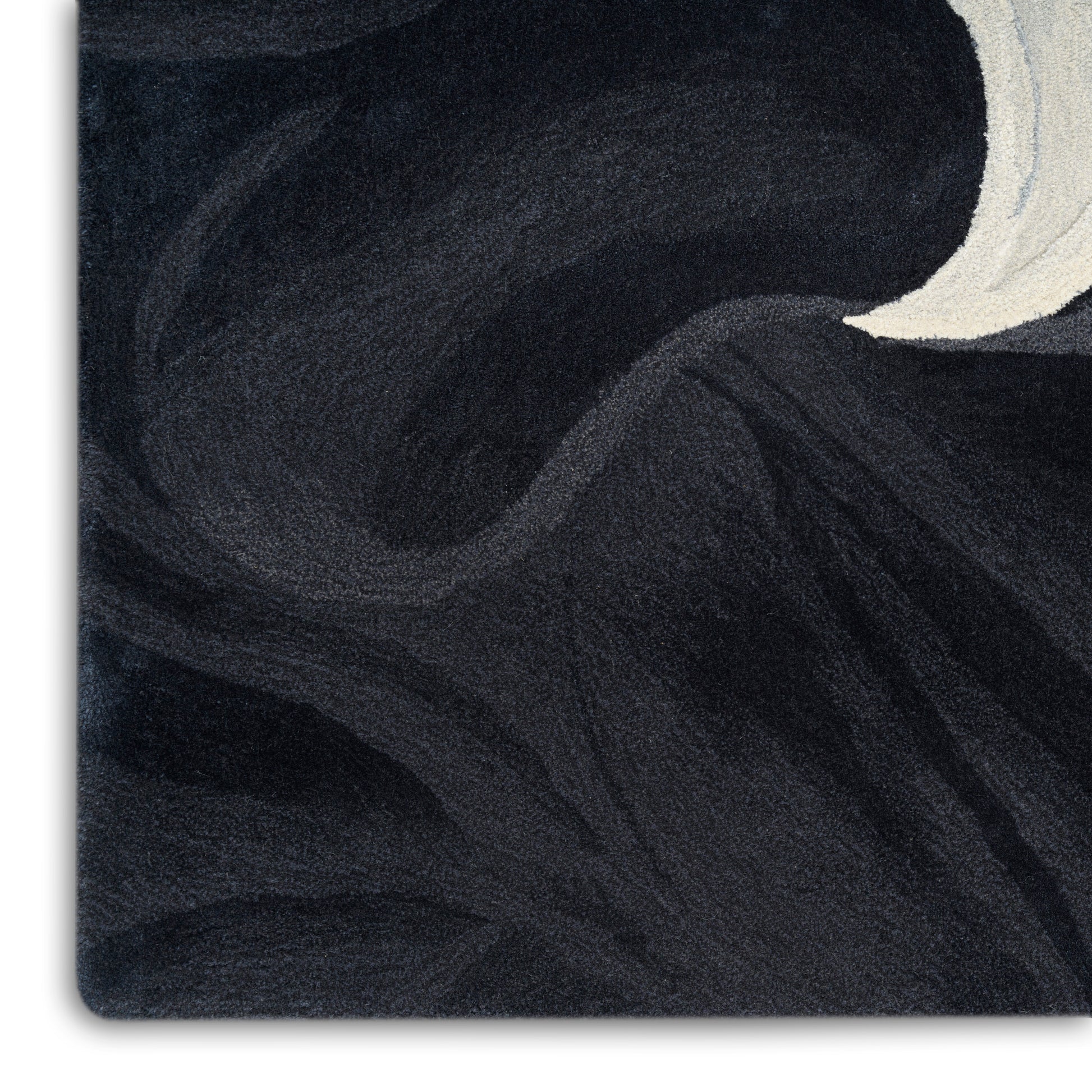 Bring any room to the forefront of avant-garde style with this abstract rug from the Prismatic collection. Swirling black, grey, and ivory tones create a deeply entrancing centerpiece, made even more stunning by a dimensional hand-carved finish. Handmade from a blend of New Zealand wool and silk-like Luxcelle™ fibers that beautifully capture changes in light.