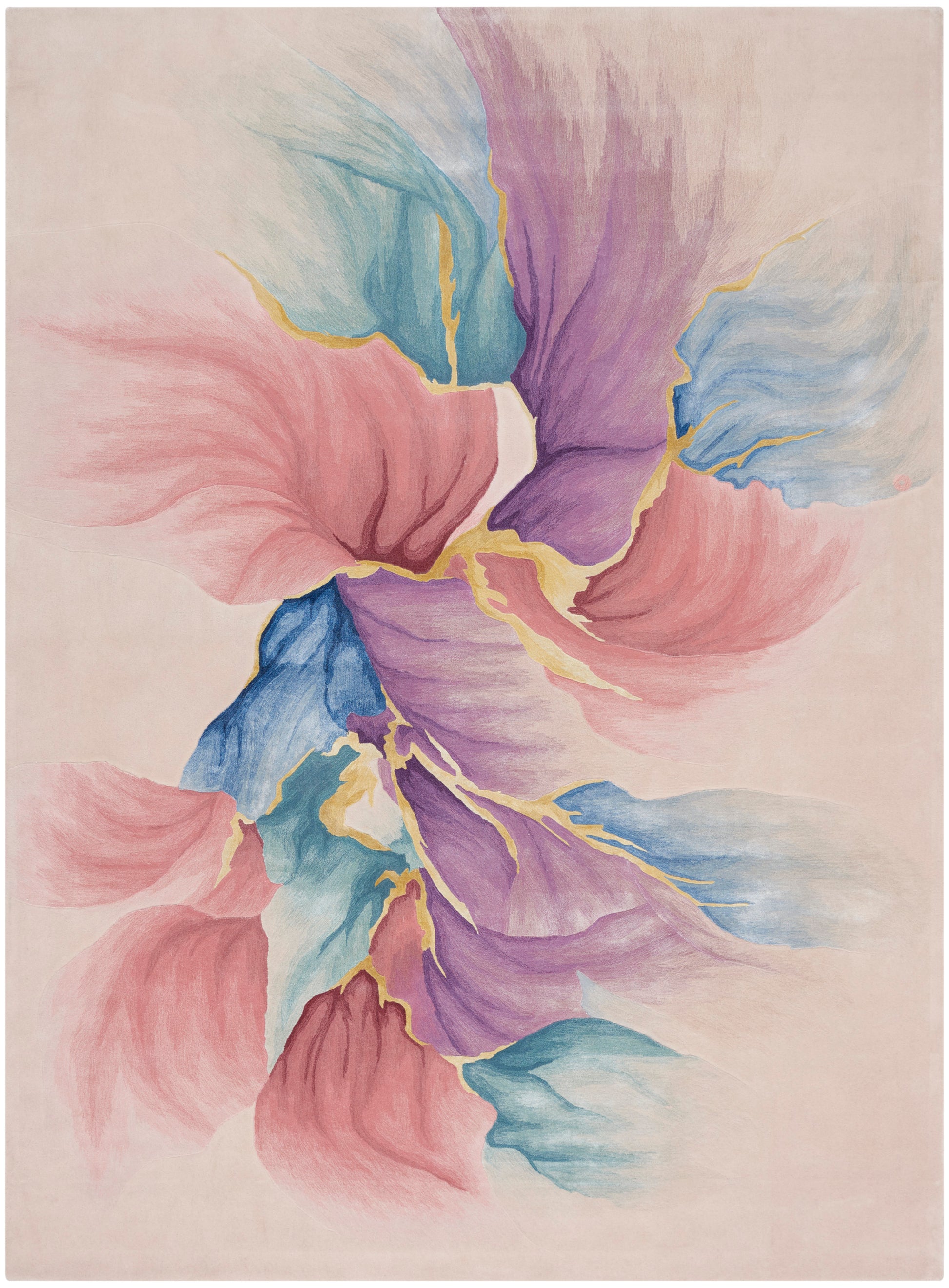 Bring mesmerizing style to your living room or bedroom with this abstract rug from the Prismatic Collection. Vibrant strokes of purple, blue, pink, and gold create movement across the solid ivory ground, which is enhanced with carved accents that add an eye-catching sense of depth. Handmade from a blend of premium New Zealand wool and silky Luxcelle™.