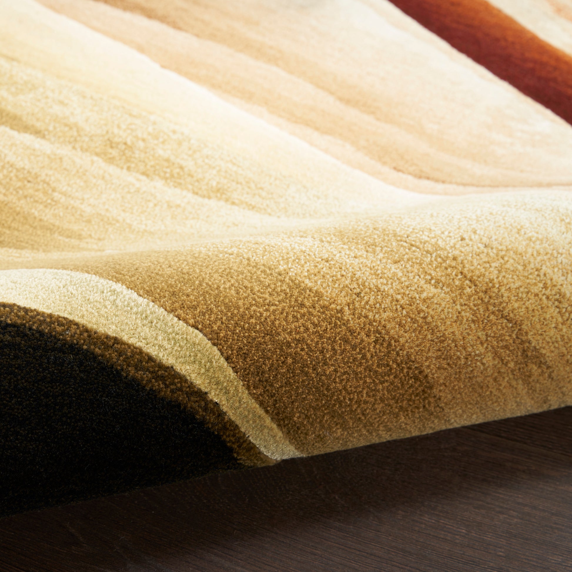 Bring your space to the height of artistic flair with this abstract rug from the Prismatic Collection. Free-flowing earth tones are complemented by a fiery blend of copper and orange, made even more stunning by stark shadows that give the illusion of depth. With hand-carved accents and shimmering highlights, this modern rug is a beautiful focal point for your décor. Handmade from the finest blend of New Zealand wool and silk-like Luxcelle™.