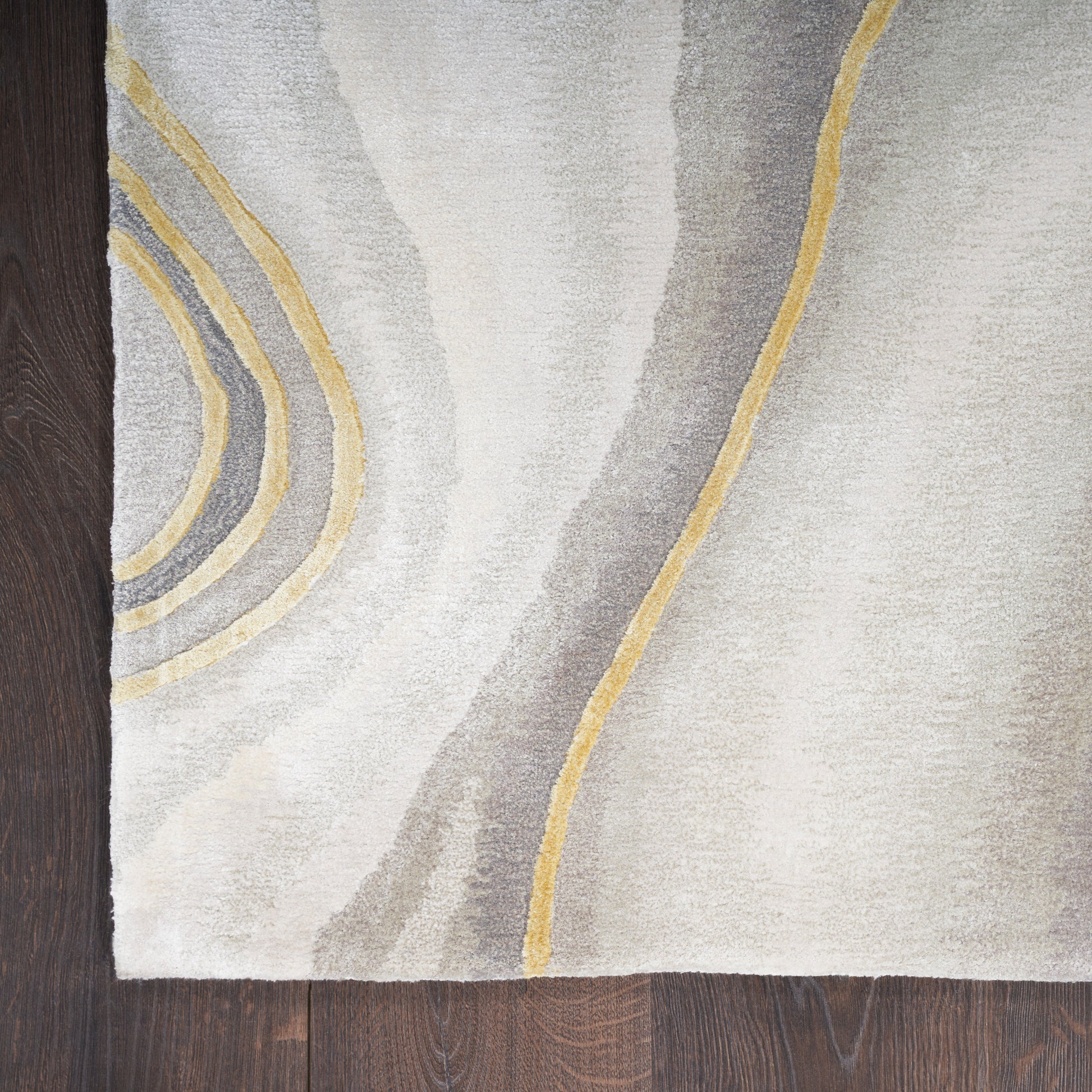Bring bold, dramatic style to your home with this abstract rug from the Prismatic Collection. Hand-carved gold swirls punctuate shades of grey and black, adding a stunning level of dimension to your living room or bedroom. Handmade from fabulously textured New Zealand wool with silky Luxcelle™ accents that beautifully capture changes in light.