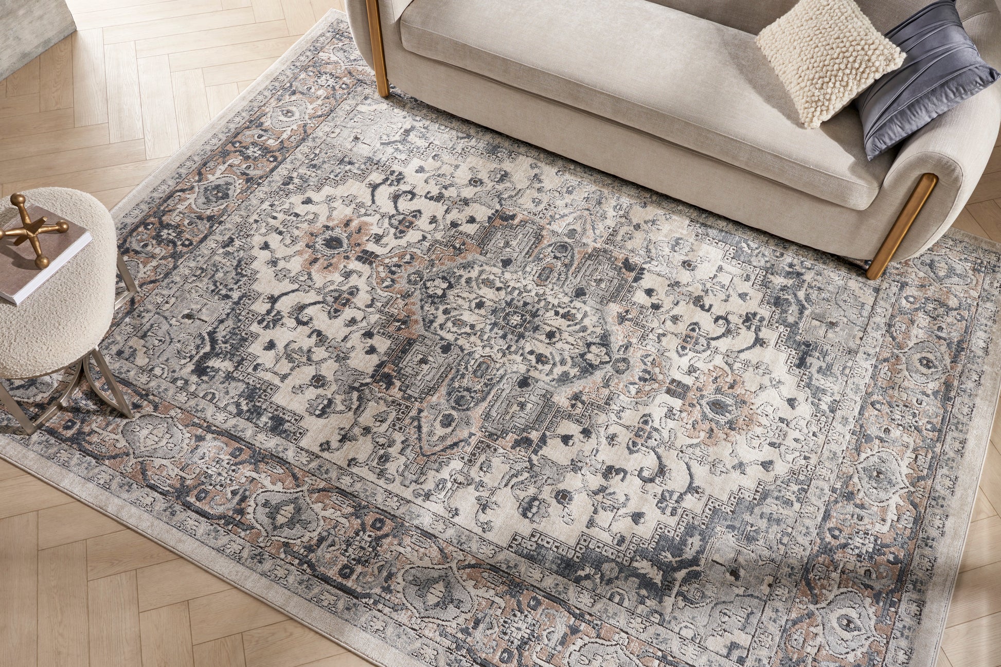 The beauty of traditional Persian "garden rug" design takes on fresh appeal with the mineral palette of the Quarry collection. Its slate grey and sand beige details sparkle on an alabaster ground. Center medallion and intricate border complete the look of this endlessly intriguing area rug.
