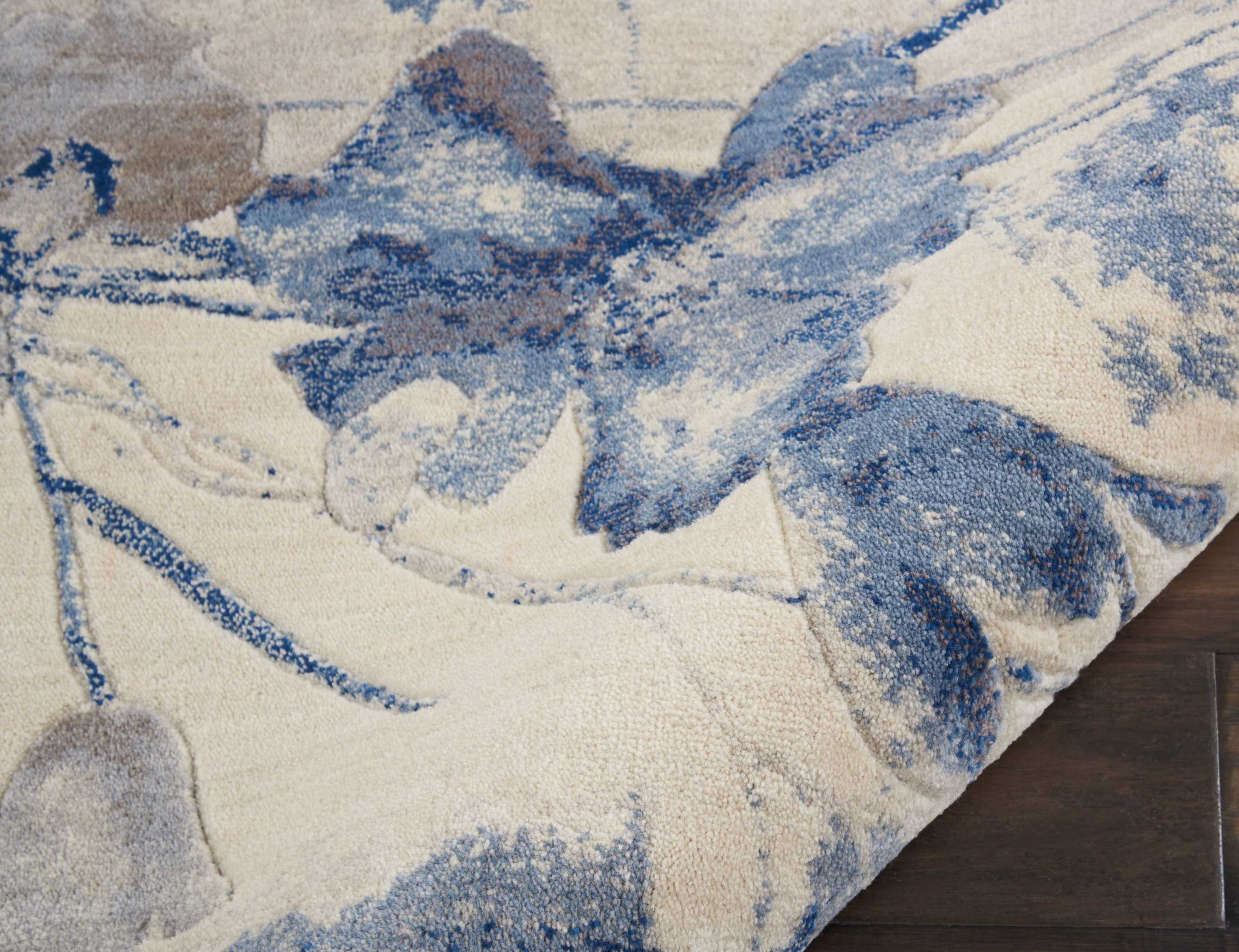 Daydreams seem to take form in this impressionistic display of irises and tulips, in abrash tones of tan, blue, taupe, and soft blue. With a stunning sheen and luxurious pile, this contemporary rug captivates completely.