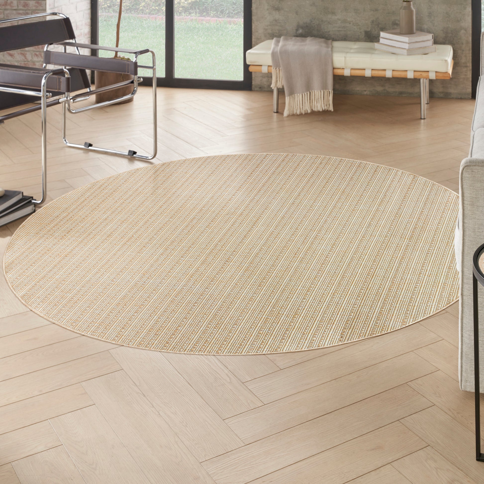 This cream outdoor rug from the Tulum collection blends geometric style with subtle sophistication. The simple striped pattern is accented with a series of raised, linear weaving coupled with tonal variations that add a unique pop of pattern to your space. This modern rug is flatwoven with a substantial feel and low-maintenance construction great for high-traffic areas both inside and outside.