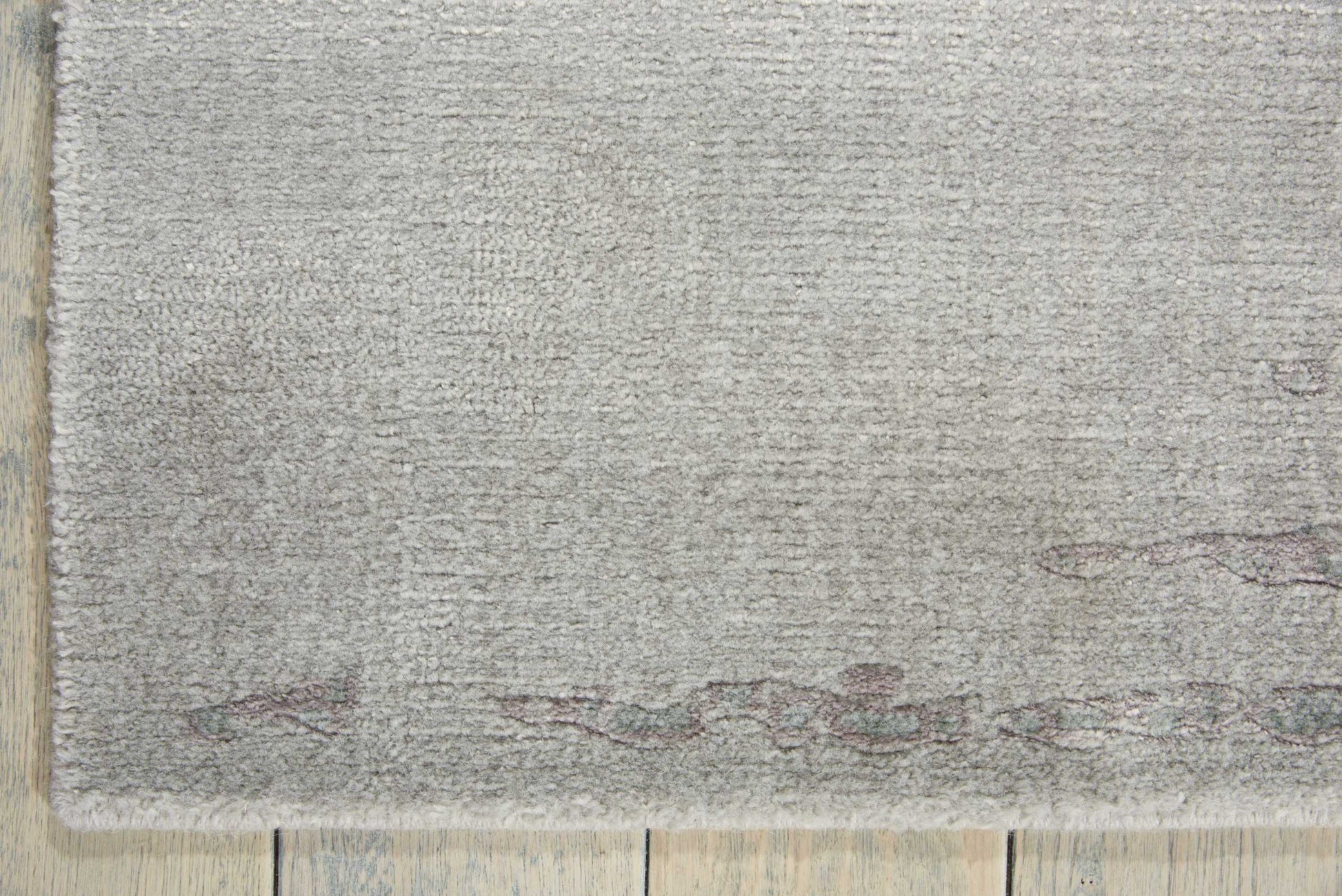 A digitized abstract design gives this superbly modernist rug an ultra-contemporary edge. Its luminous tones of silvery mist and fog are beautifully evocative. Bring subtle impact to your room with this unique textile.