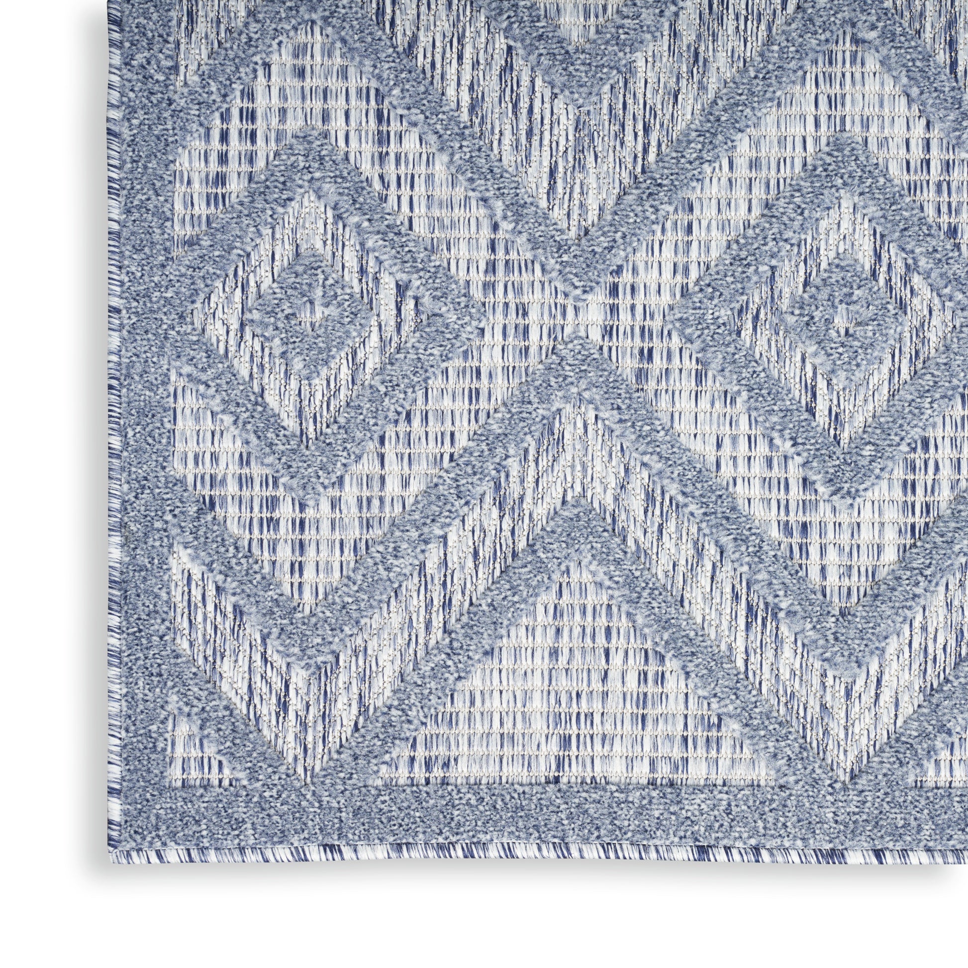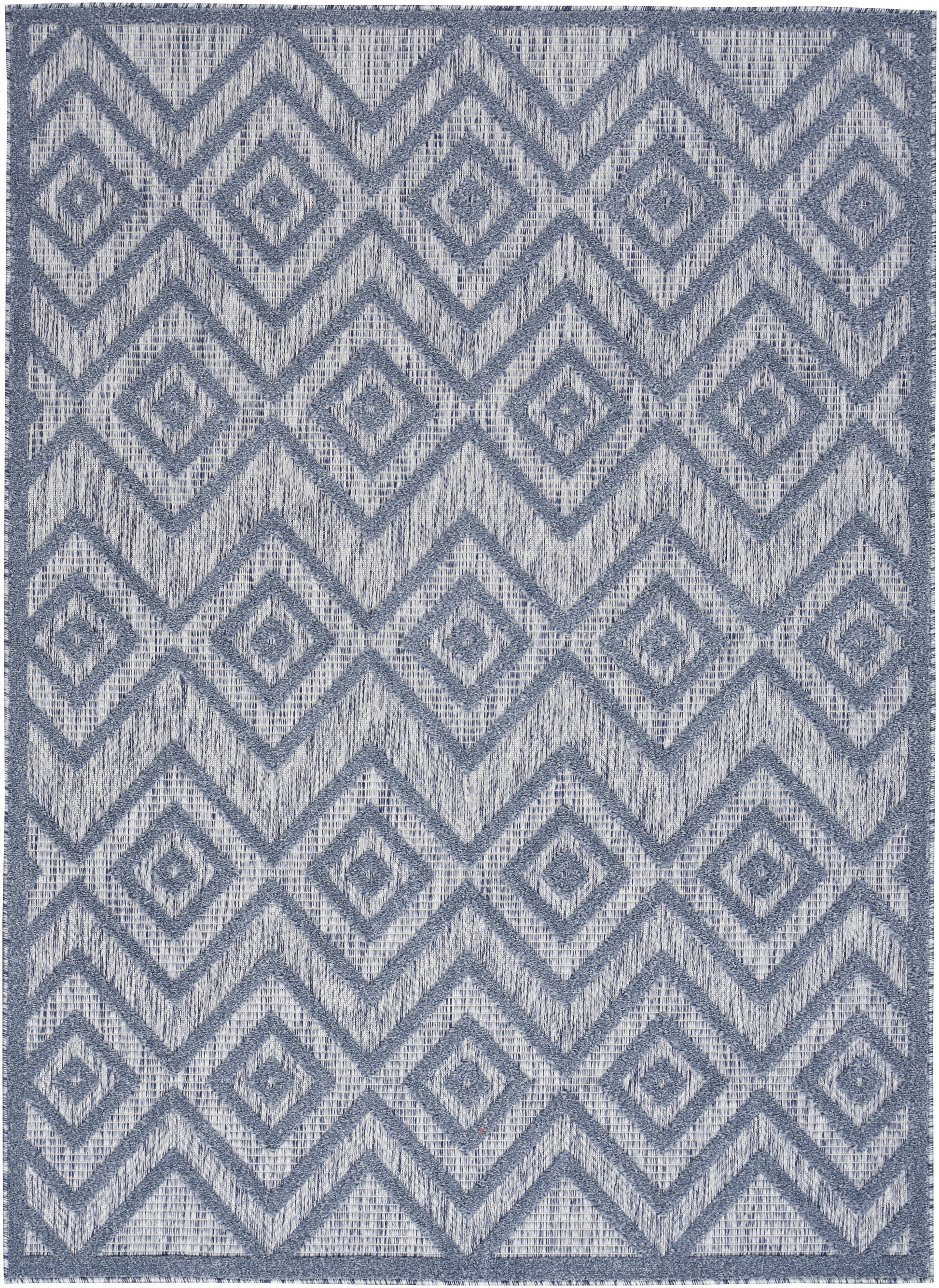 This denim blue Nourison Versatile Collection rug brings inviting style to your favorite indoor or outdoor space. With a raised diamond design that stands out beautifully against its flatwoven ground, this outdoor rug enhances your space with delightful texture and modern appeal. Machine-made from durable, easy-to-clean fibers, Versatile is great for high-traffic areas inside the home as well as all seasons spent outdoors. To care for this rug, we recommend rinsing outdoors with a hose. Air dry both sides fully; do not place into a washing machine.