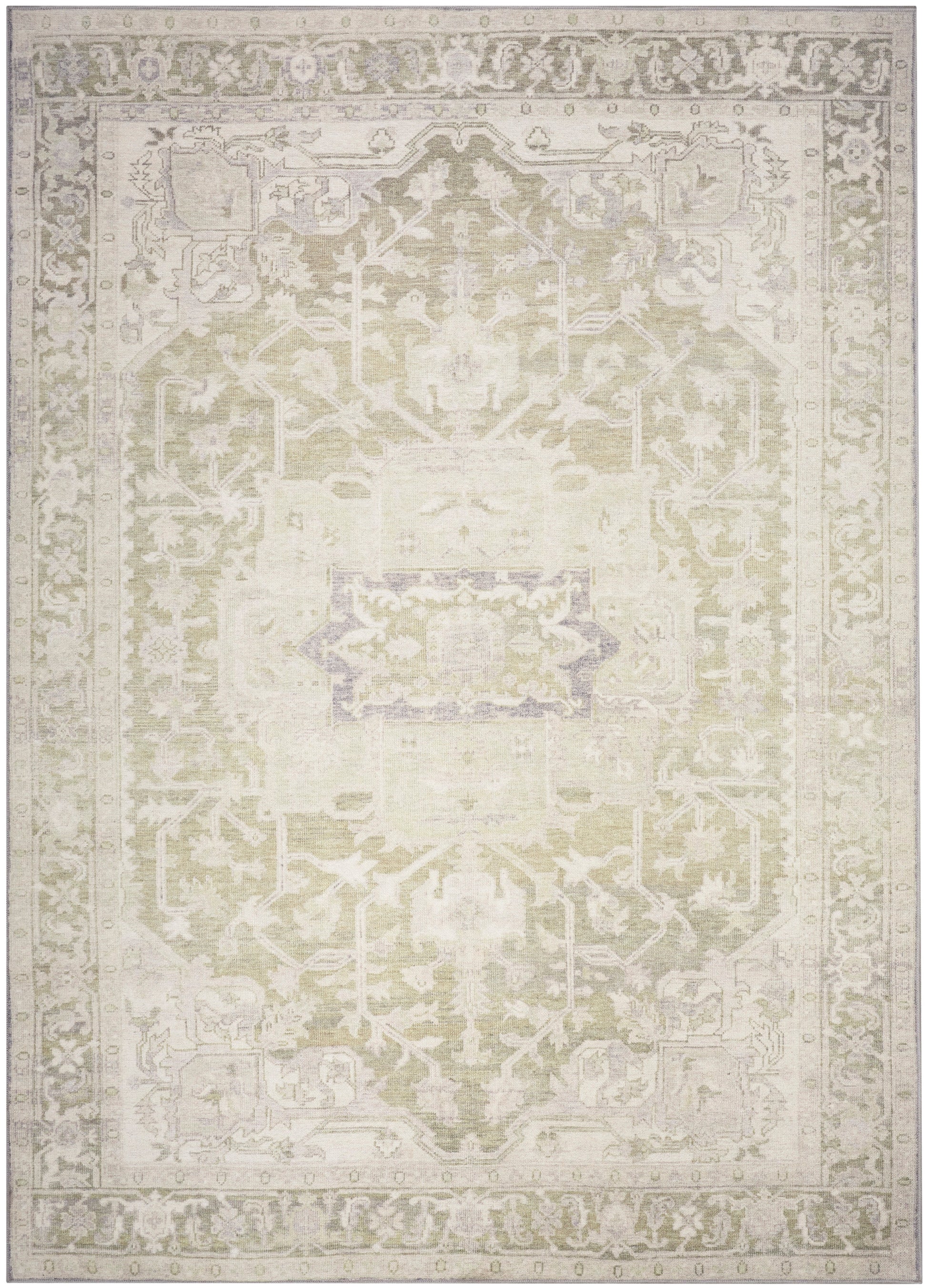 From the Vintage Washables collection comes this stunning, vintage-inspired green rug designed for modern living. Showcasing an ornate center medallion pattern with an artfully aged finish, this rug easily adds an air of regal sophistication to the living room, bedroom, or dining room. Made from polyester with a non-skid back and flatweave, washable construction that ensures effortless maintenance and enduring style.