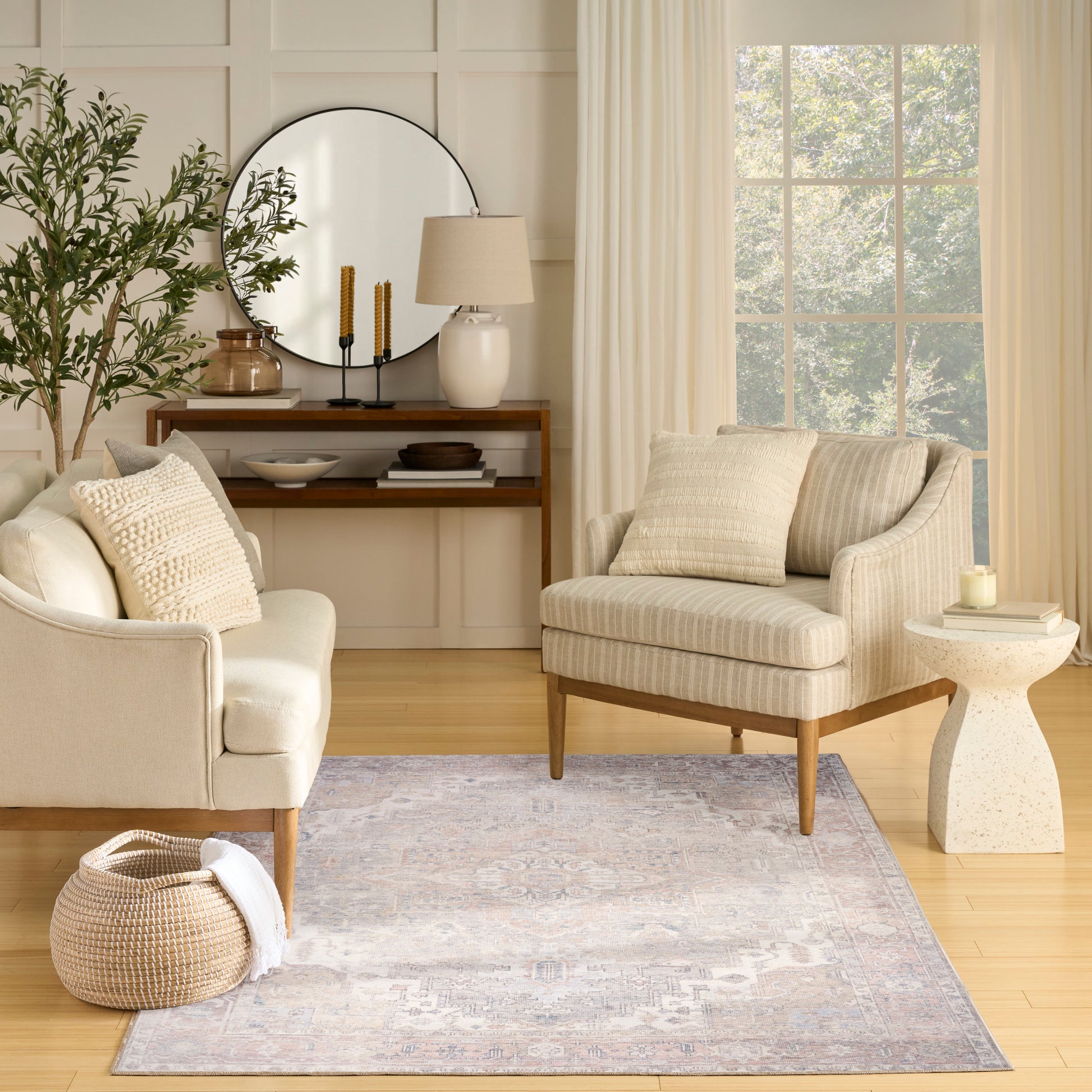 This vintage-inspired light blue rug from the Vintage Washables collection features a timeless pattern that invites a classic feel to your surroundings. The distressed finish enhances its antique charm, while the muted color palette adds to its heirloom appeal. Flatwoven with a non-skid back and washable, this polyester rug is as practical as it is elegant.