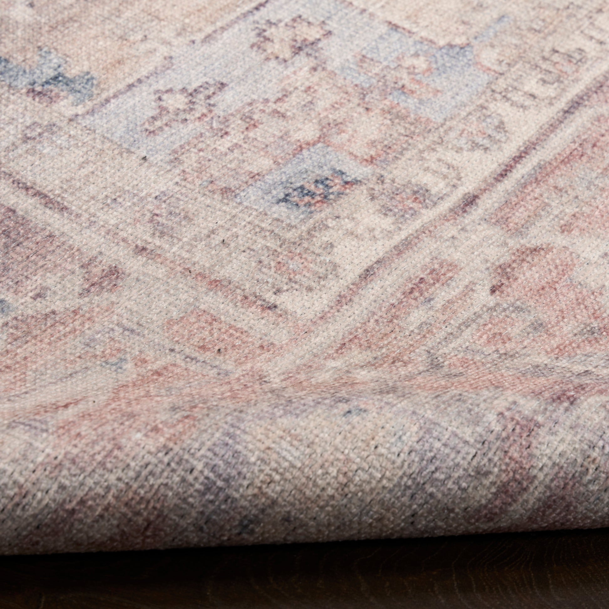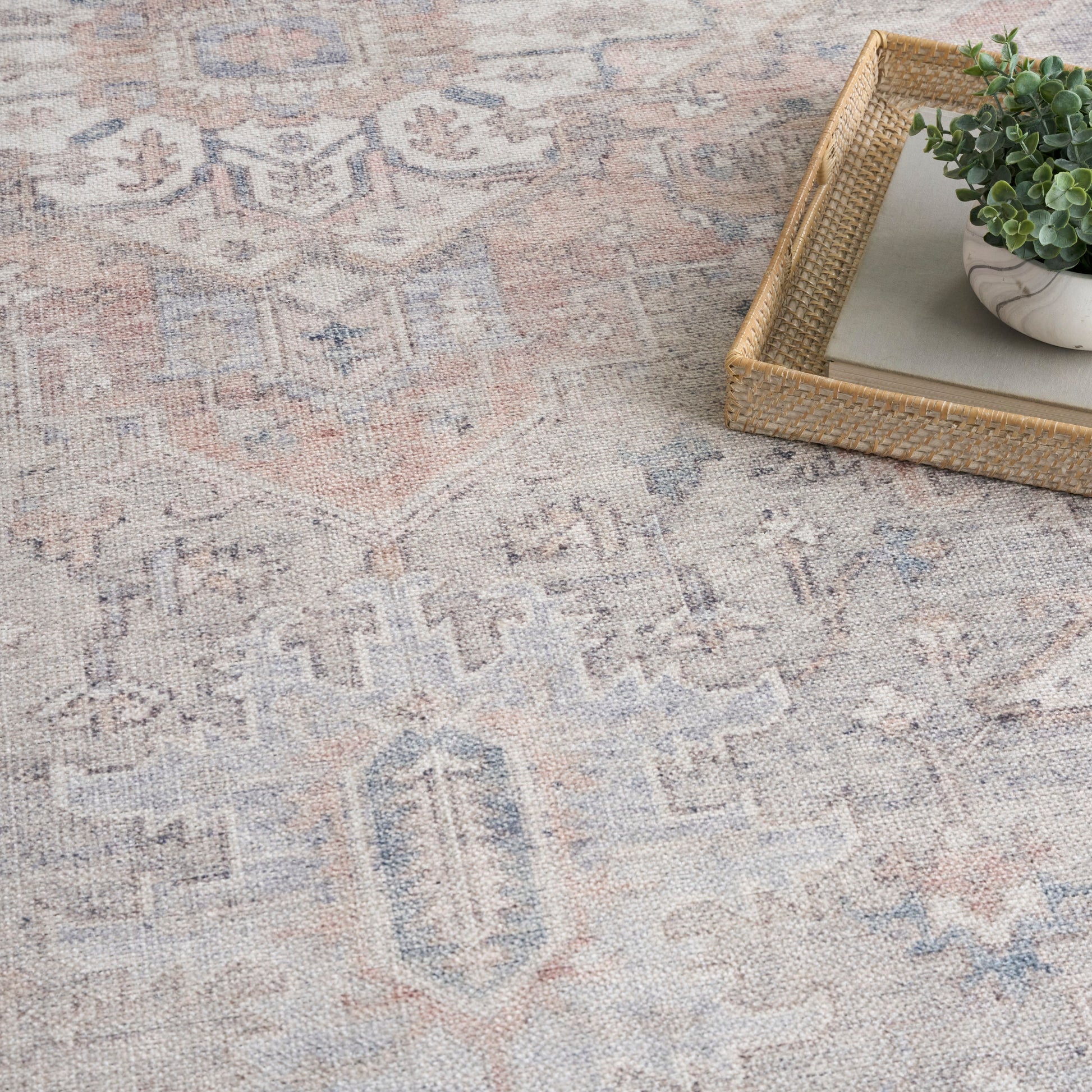 This vintage-inspired light blue rug from the Vintage Washables collection features a timeless pattern that invites a classic feel to your surroundings. The distressed finish enhances its antique charm, while the muted color palette adds to its heirloom appeal. Flatwoven with a non-skid back and washable, this polyester rug is as practical as it is elegant.