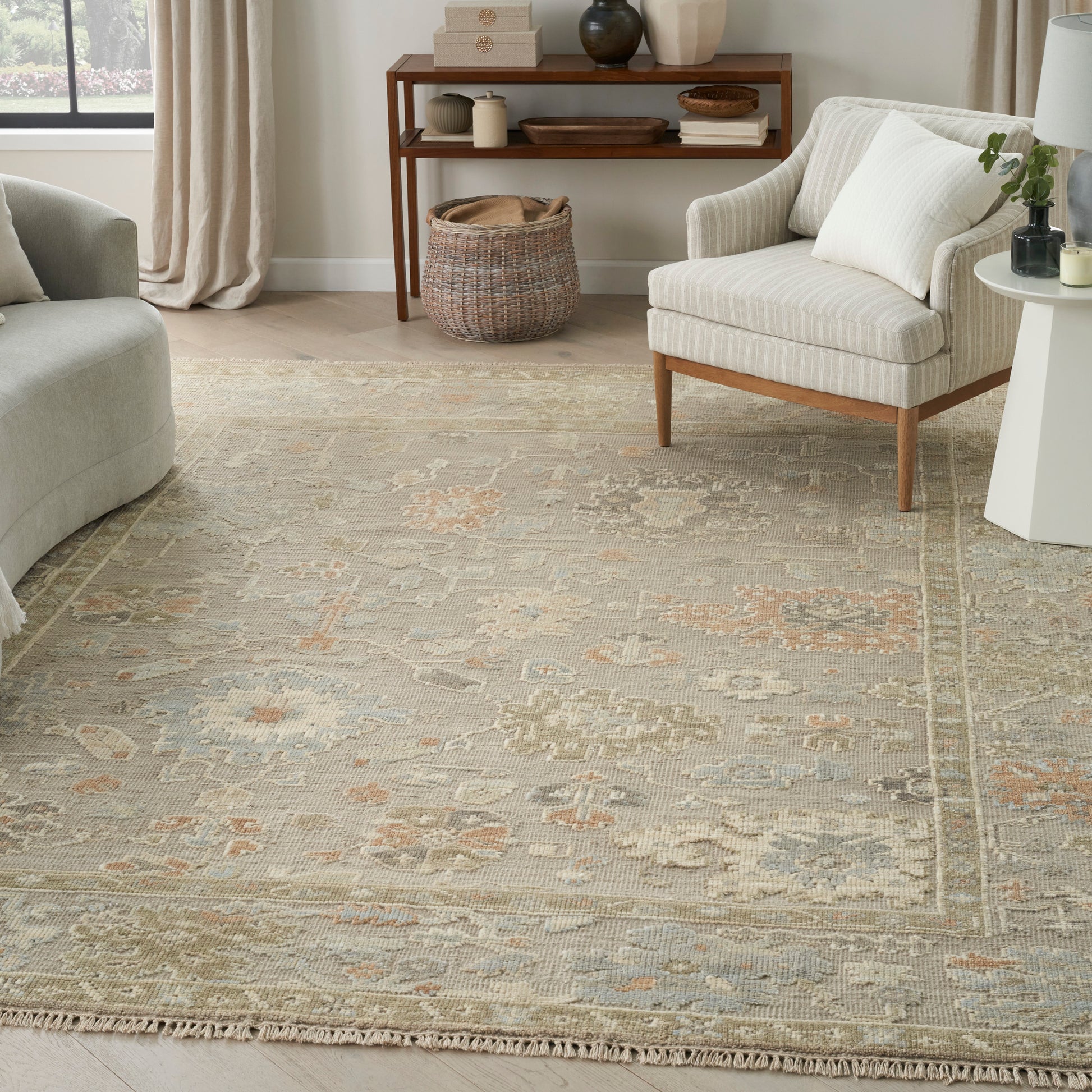 Add character and a touch of vintage-inspired allure to your home with the Whispers Collection. This hand-knotted rug showcases a Persian floral pattern, finished at both ends with a short fringe that echoes the look of a treasured heirloom. Presented in taupe grey for easy coordination with a variety of styles.