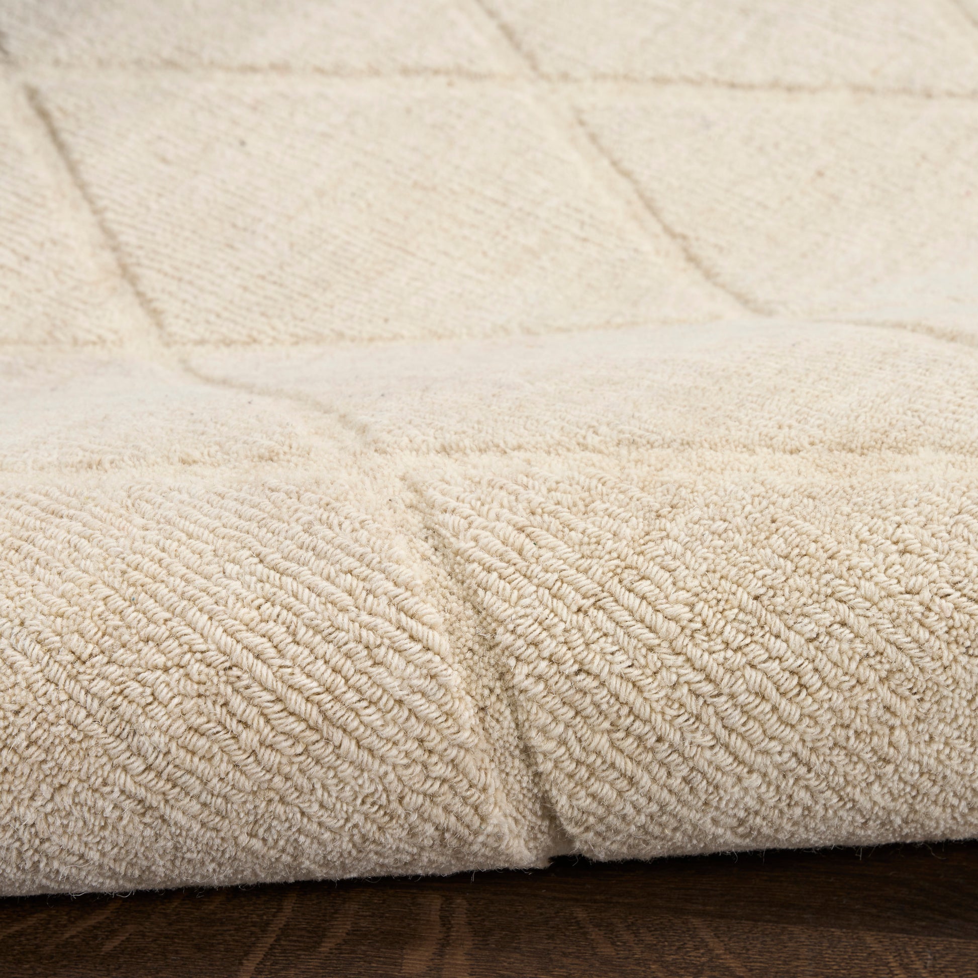 Invite a touch of understated elegance to your space with this ivory geometric rug from the Wool Haven Collection. Featuring a simple trellis pattern on a solid ribbed ground, this rug boasts a soft texture that feels great on bare feet. This handmade rug is woven from 100% wool yarn that is naturally durable and easy to clean.