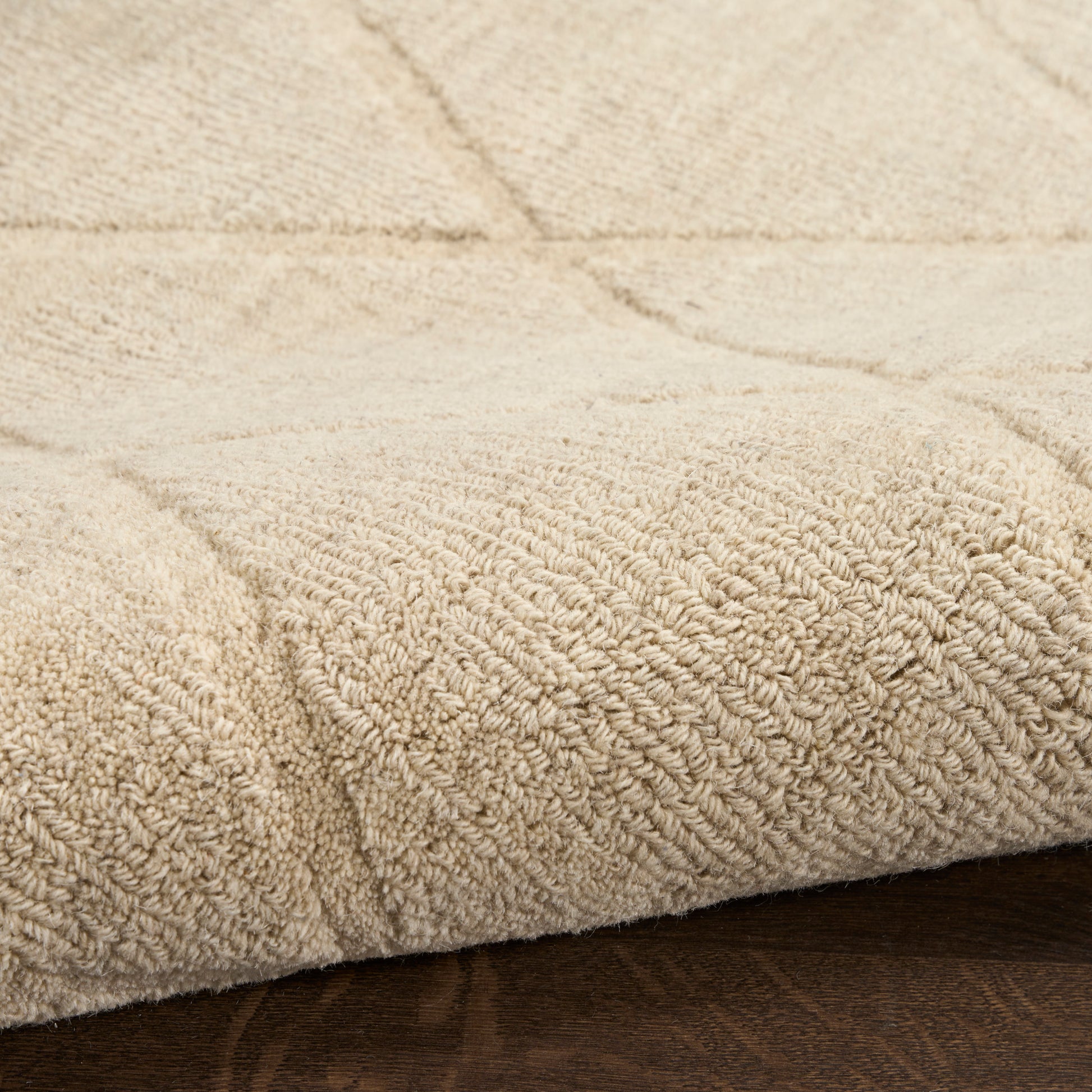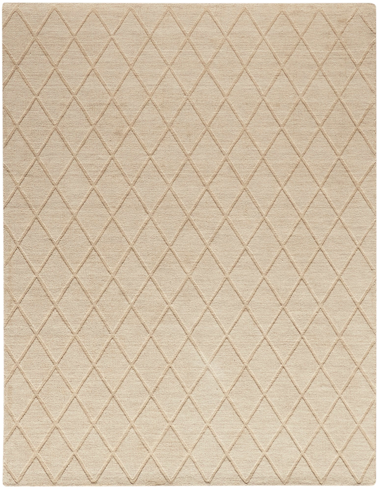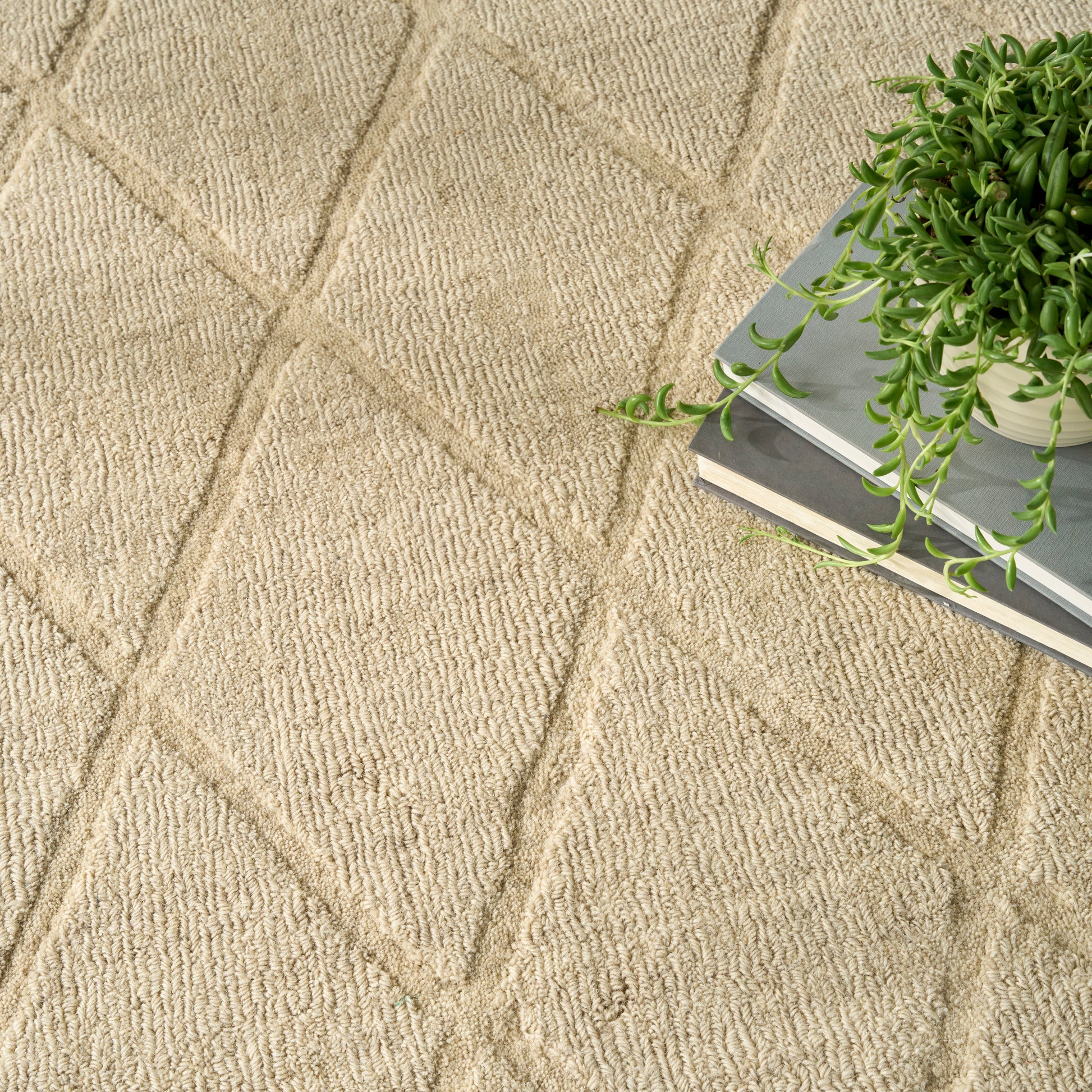 Invite a touch of understated elegance to your space with this beige geometric rug from the Wool Haven Collection. Featuring a simple trellis pattern on a solid ribbed ground, this rug boasts a soft texture that feels great on bare feet. This handmade rug is woven from 100% wool yarn that is naturally durable and easy to clean.